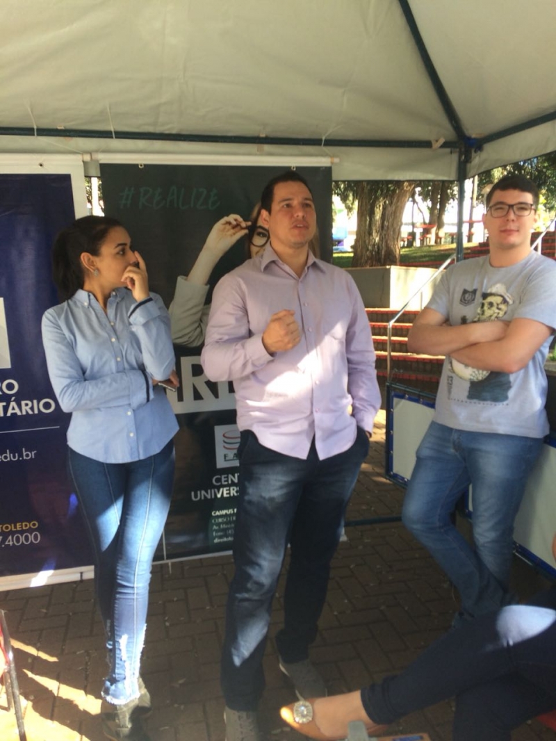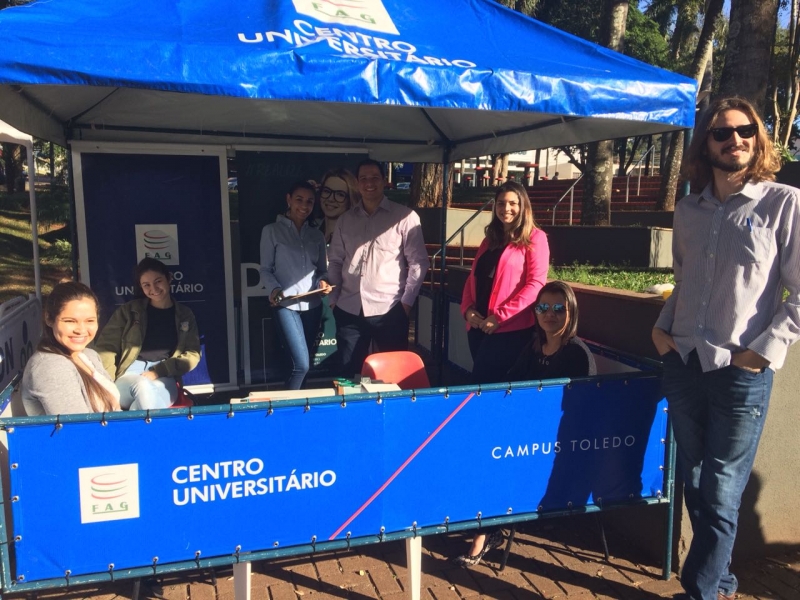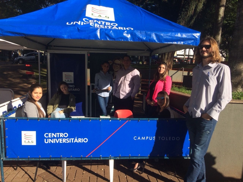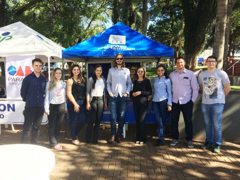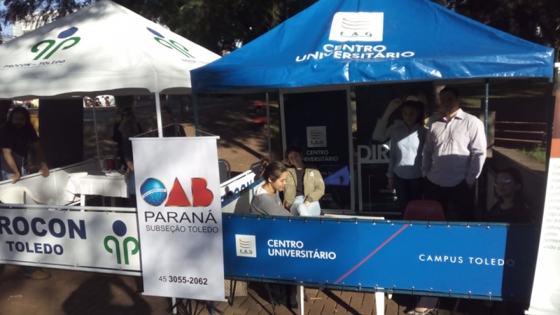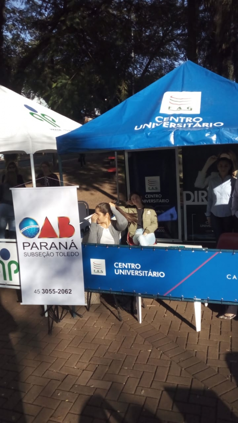 O Núcleo de Práticas Jurídicas (NPJ) da FAG Toledo participou no último sábado (23) do Dia da Cidadania na Praça Willy Barth. O evento organizado pela seccional Toledo da Ordem dos Advogados do Brasil (OAB) reuniu profissionais da área e estudantes de Direito, que prestaram orientações sobre justiça com foco nos direitos dos idosos, crianças e adolescentes, pessoas com deficiência, família, trabalho, direito eleitoral entre outras áreas. A equipe da FAG montou um estande na praça e participou do evento esclarecendo dúvidas diversas de quem passava pelo local. Os trabalhos foram coordenados pelo professor Marco Batistella Longo que juntamente com os colegas e estudantes prestou esclarecimentos sobre as mais diversas frentes de atuação do NPJ da FAG Toledo. "Os acadêmicos puderam ter um contato direto com as demandas de pessoas migrantes, dentre elas a orientação para procedimentos de concessão de residência temporária e definitiva, opção de nacionalidade e naturalização bem como alguns casos de orientações envolvendo cidadãos com demandas da área de direito previdenciário e contrato de compra e venda de veículo com defeitos e compra pela internet, nesses dois casos, com auxílio do PROCON", relata o docente, ressaltando sobre a importância da participação dos estudantes no evento. "Foi rica em aprendizado e compartilhamento de experiências entre veteranos e iniciantes, inclusive, além de ressaltar ainda mais, para a população, a importância da atuação do Escritório Modelo do NPF da FAG Toledo, na formação de futuros profissionais do Direito com responsabilidade, técnica aprimorada, e ética no trato", comenta.