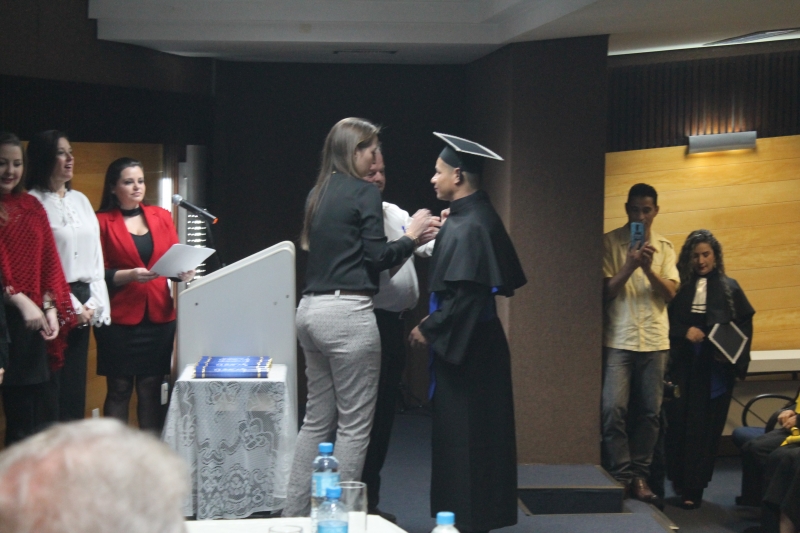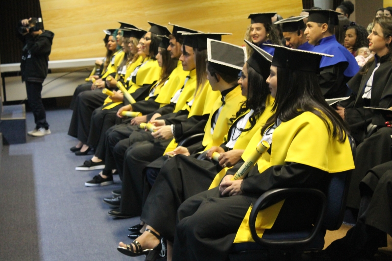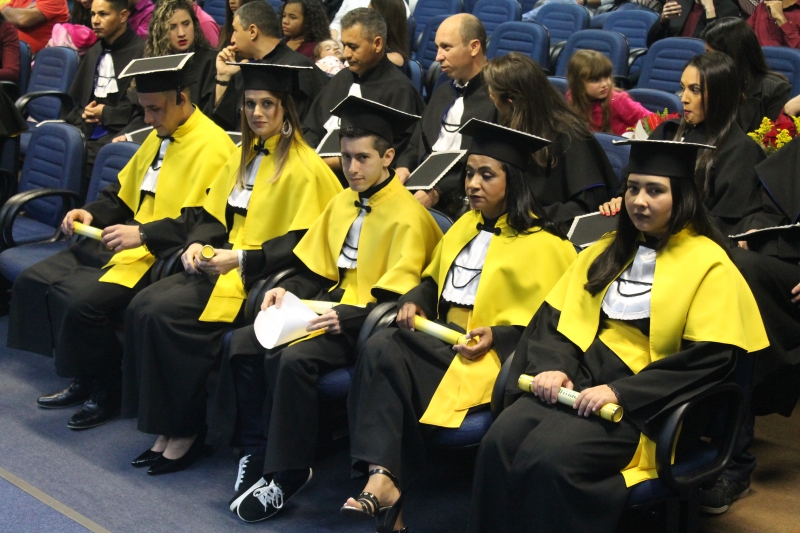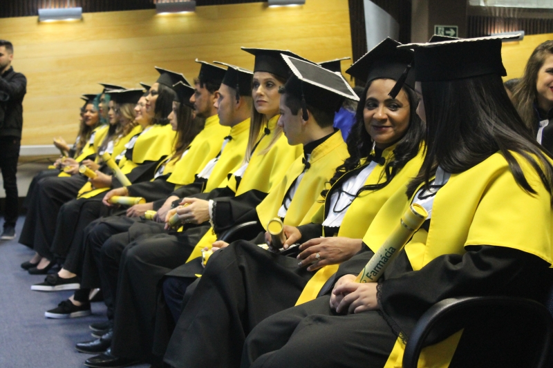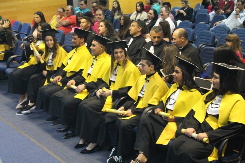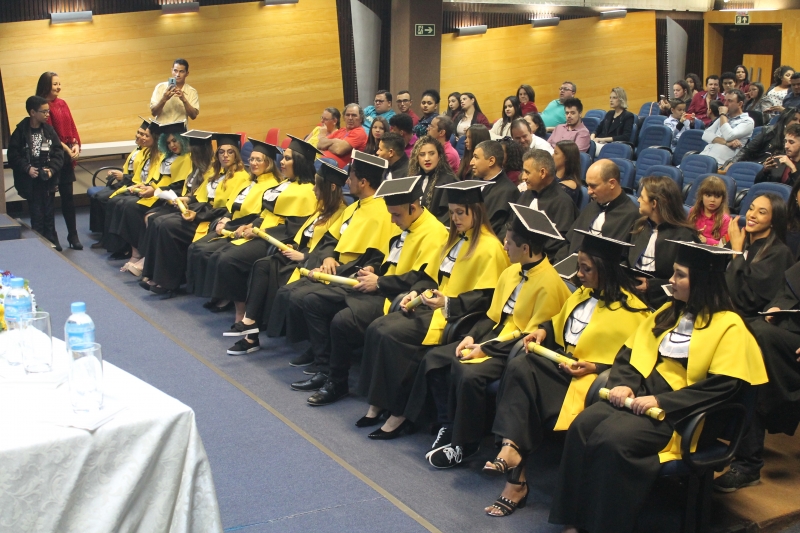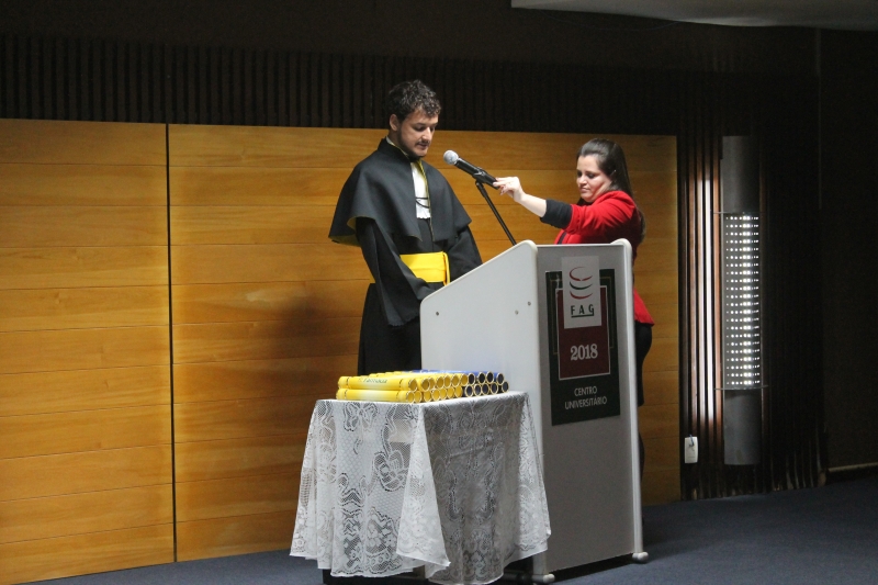 O auditório da FAG Toledo abriu as portas para uma cerimônia mais do que especial na última sexta-feira (13). A instituição cedeu o espaço para que o Colégio Estadual Luiz Augusto Morais Rego realizasse a formatura dos cursos técnicos de Química e Farmácia. O diretor da FAG Toledo, Ildo Bombardelli foi um dos convidados da mesa de honra. Junto dele estava o diretor do colégio, José Carlos Guimarães, a professora Rosemari Zeni representando o Núcleo de Educação além de representantes da equipe pedagógica, APMF e coordenadores dos cursos. Os formandos, 14 do curso técnico de Farmácia e oito do curso técnico em Química receberam o grau, certificados e homenagens de professores e representantes da mesa. Na plateia, pais e familiares acompanharam emocionados a cerimônia. O diretor da FAG os presentes. "A instituição é parceira dos colégios e sempre terá portas abertas para a comunidade. Temos aqui um espaço de integração que deve ser palco de momentos como este em que os estudantes, mesmo os de nível médio e técnico possam acender na vida profissional", comenta.
