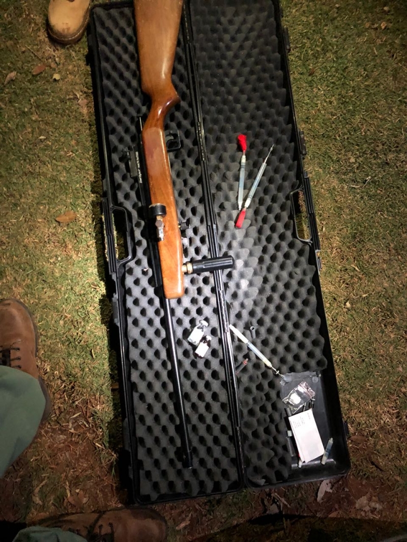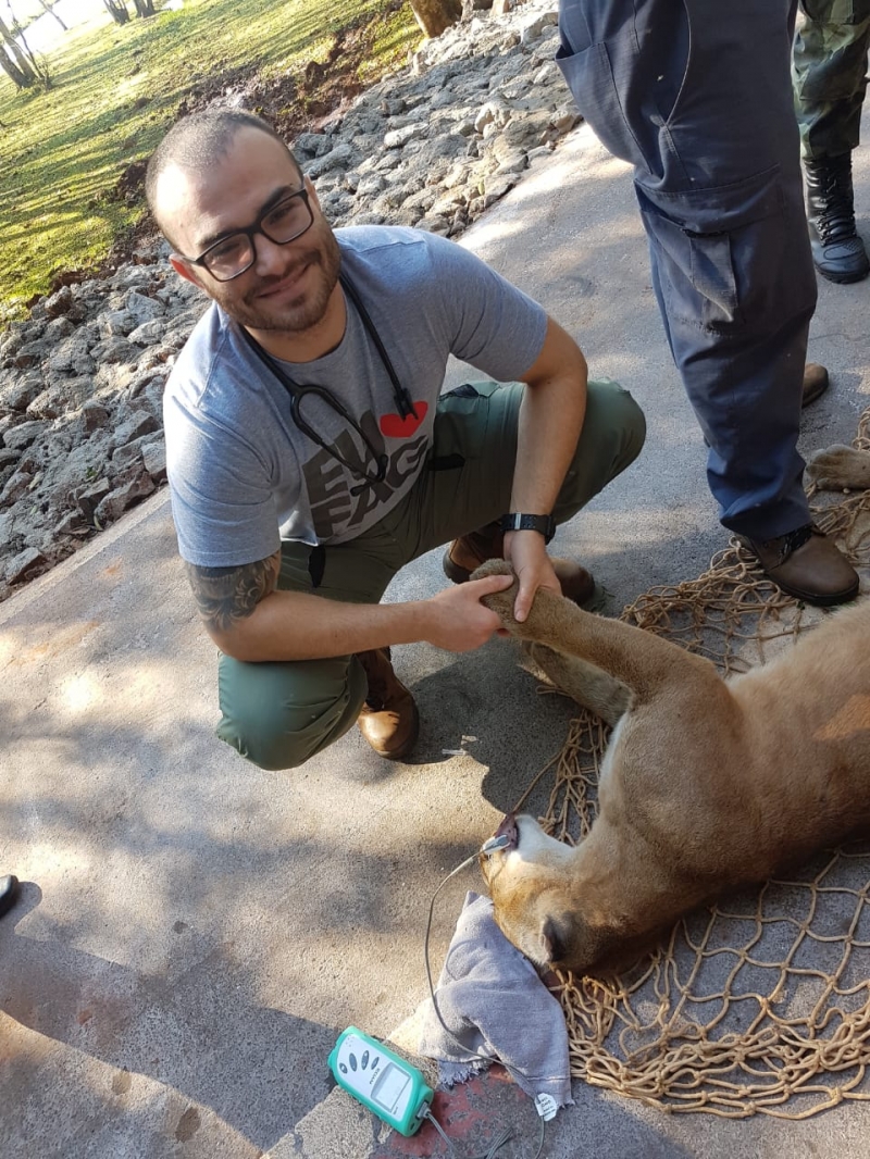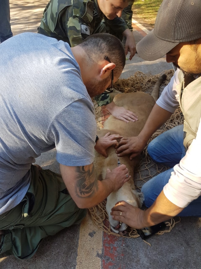 Neste dia cheio, Rodrigo teve um papel fundamental: anestesiologista, foi dele a função de atirar os dardos com sedativos para conter o animal e também de fazer a coleta de sangue e sêmen para exames. Rodrigo também acompanhou a transferência da onça para o Parque Estadual Rio Guarani, no município de Três Barras do Paraná. Lá, o animal foi solto na natureza. "Foi um trabalho exaustivo, porém, conseguimos o êxito. Foram armadas sete armadilhas e, na primeira que foi montada, a onça foi capturada", comenta Rodrigo.