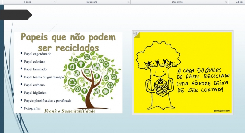 Quanto ao consumo de papel a proposta é trabalhar com a redução, a reutilização e a reciclagem. "Reduzir o tamanho da letra de um texto a imprimir, usar o meio eletrônico de forma mais efetiva para as comunicações e reutilizar o verso de folhas já impressas como rascunho são soluções simples que podem contribuir com a redução do uso de papel. Cada folha que você repensa o uso é um pedaço de uma árvore que deixa de ser cortada", alerta a assessora.