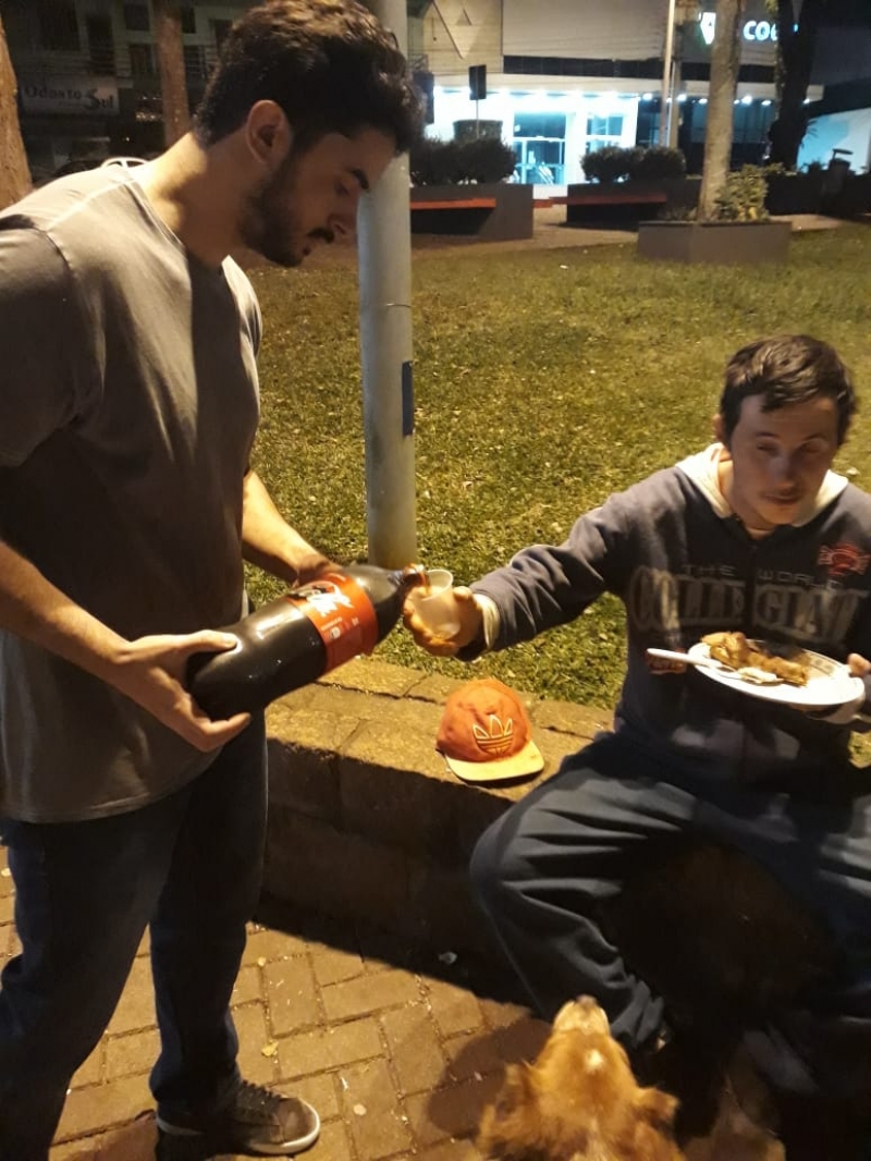 Estudantes do curso de Gestão Financeira da FAG Toledo visitaram um projeto social que não tem sede própria, mas que semanalmente tem data e hora para reunir voluntários e beneficiários. Trata-se do projeto "Alimente-se de Graça", que serve jantares, roupas e outros donativos para moradores de rua e famílias carentes de Toledo três vezes por semana, na Praça Willy Barth. A proposta de realizar uma atividade social foi lançada pela professora Maria Rita Pozzebon, que ministra a disciplina de "Ética e Responsabilidade Social" no núcleo comum dos cursos de Gestão Financeira, Processos Gerenciais e Gestão de Recursos Humanos. "Nós arrecadamos uma quantia em dinheiro para comprar alimentos e também conseguimos a doação de alimentos e roupas para os beneficiados" relata o idealizador da visita e acadêmico de Gestão Financeira da FAG Toledo Edemar Steinmetz. Ele ressalta que a atividade foi uma verdadeira aula sobre responsabilidade social. "A experiência é incrível, pois no dia a dia, muitas vezes nem nos damos conta de quantas pessoas estão sem ter onde dormir e também que estejam sem se alimentar, e fazendo parte desse projeto você se da conta de quantos estão precisando se alimentar. O mais importante, além dos alimentos, é refletir e entender que eles precisam ser lembrados na sociedade, precisam de um abraço e uma boa conversa. Pela experiência que tivemos, foi possível constatar que isto tem muito valor para eles", reflete.