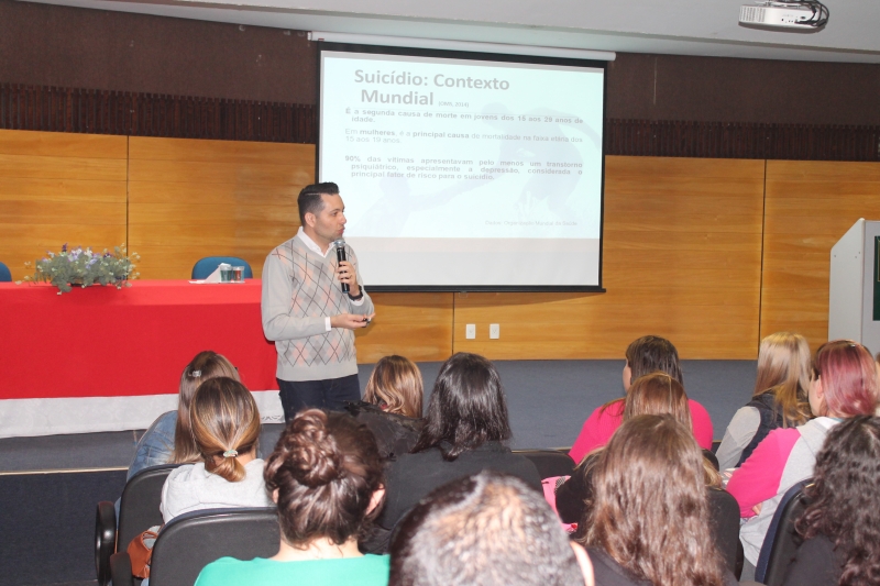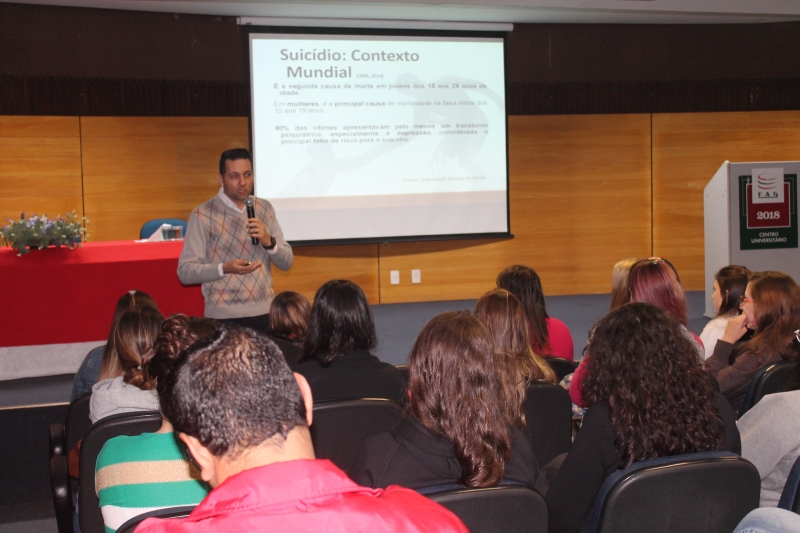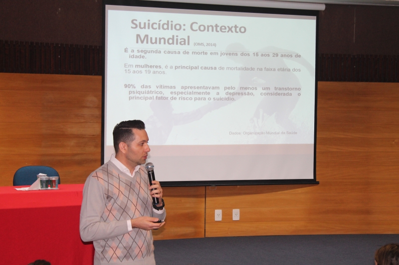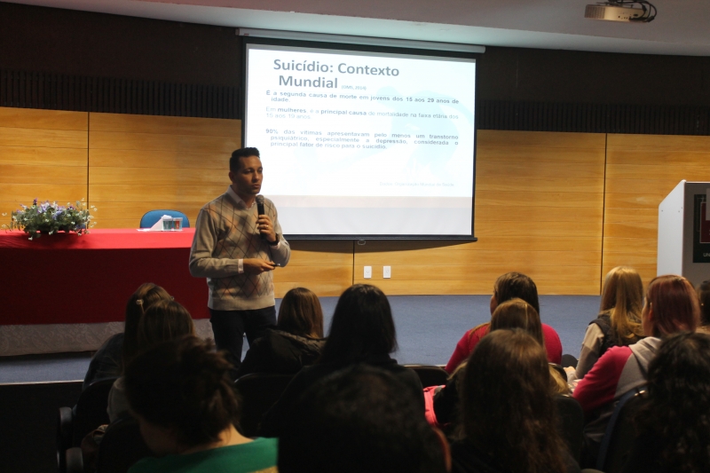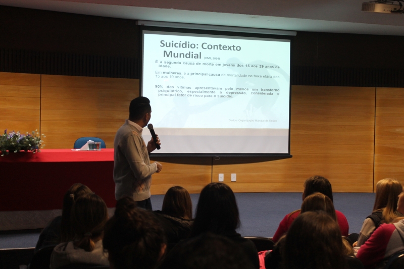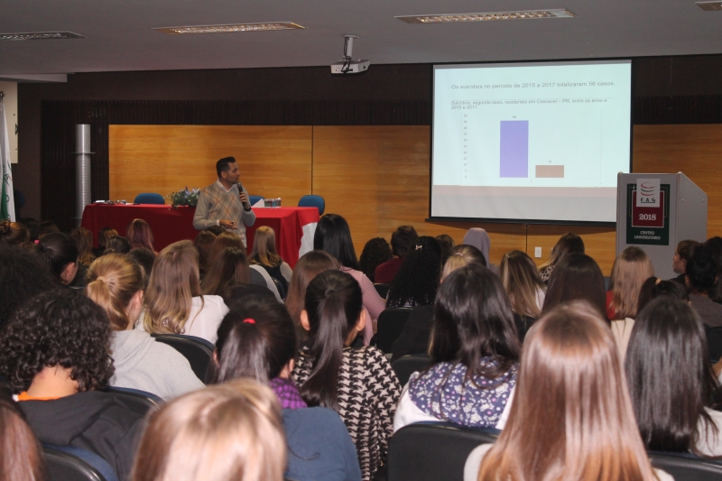 A aula magna do segundo semestre do curso de Pedagogia da FAG Toledo abordou um assunto polêmico, urgente e necessário: o suicídio. O convidado para palestrar foi o psicólogo Cristiano de Souza, docente do curso de Psicologia do Centro FAG. Para alunos e professores do curso ele falou sobre a importância do profissional da educação estar bem informado e atento as diversas situações que podem culminar em uma tentativa de suicídio. "É preciso desmistificar o tema porque existe muito aquela ideia de que a pessoa está apenas querendo chamar a atenção ou a ideia de que quem fala não faz e não é por aí. Nós temos números preocupantes com relação ao assunto e precisamos contextualizar isto dentro da rede de educação, pois muitas vezes é lá que o sujeito vai pedir socorro", explica.