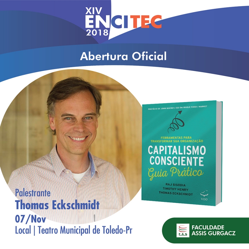 O diretor geral do Instituto Capitalismo Consciente Brasil, CEO e cofundador da plataforma online para resolução de conflitos comerciais ResolvJá Thomas Eckschmidt é o palestrante convidado para abrir a 14ª edição do Encontro Científico e Tecnológico (ENCITEC) da FAG Toledo. O evento com a palestra acontece no dia 7 de novembro no Teatro Municipal a partir das 19h. O tema da palestra será "Capitalismo Consciente", considerado por Thomas uma prática que usa a força das empresas para servir ao desenvolvimento da humanidade. "São quatro princípios básicos que norteiam uma empresa que pratica o Capitalismo Consciente. Começa com o propósito, depois a orientação para grupos de interesse, seguindo com questões de liderança e a cultura conscientes, auxiliando as empresas na criação de confiança e negócios saudáveis, perenes e resilientes", explica o autor.