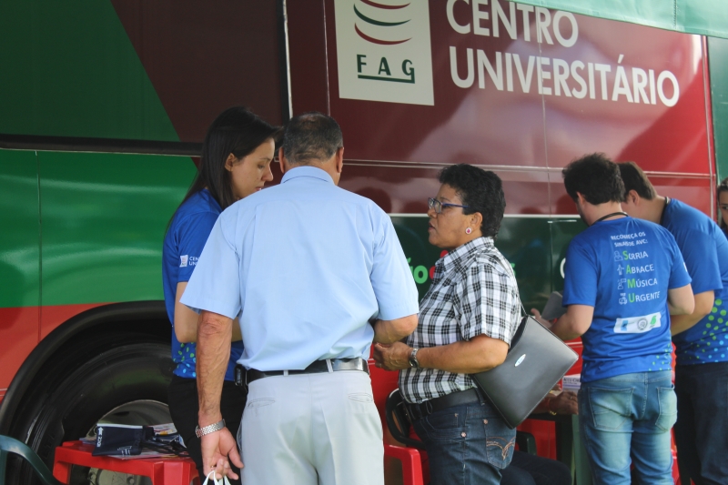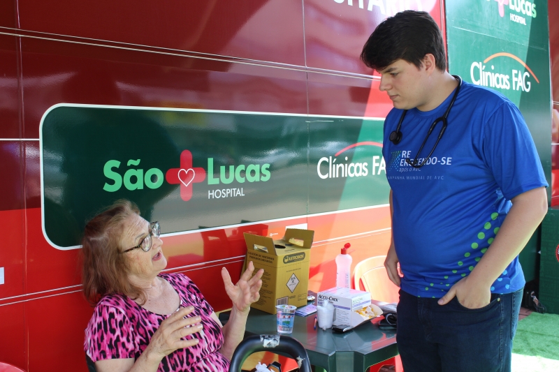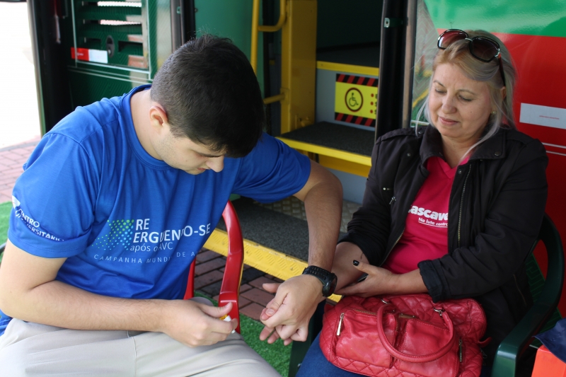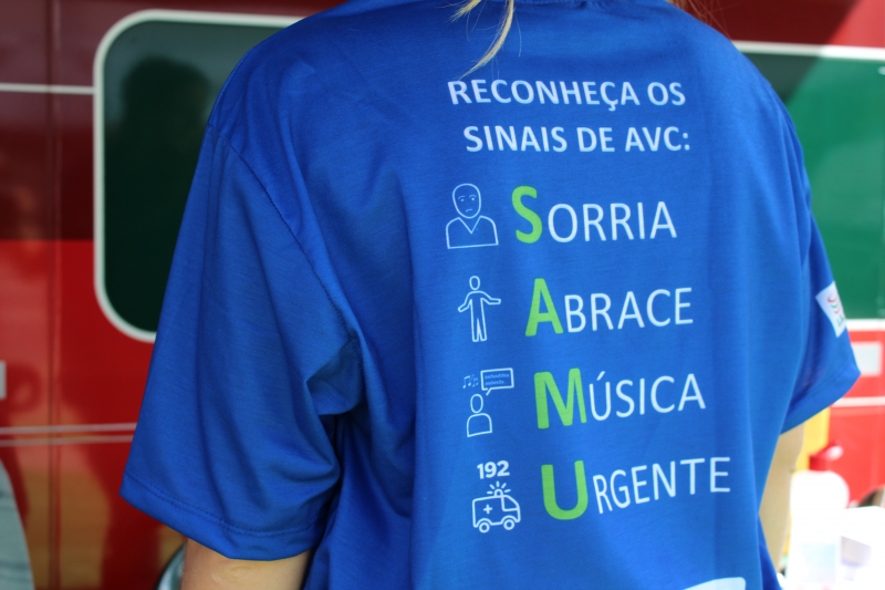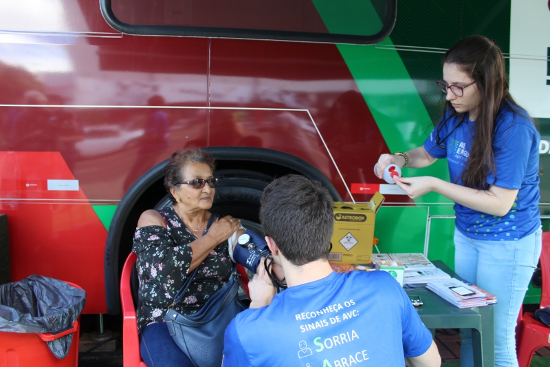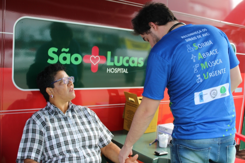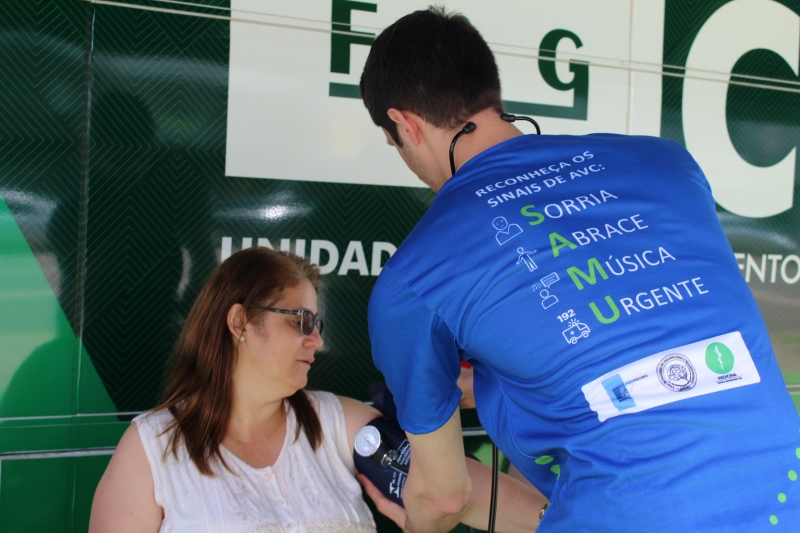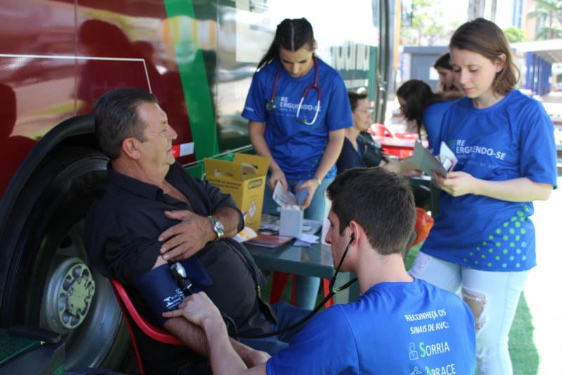 Quem passou pelos ônibus pode ter a pressão aferida e também passou por teste de glicemia. Para conscientizar a população, os alunos distribuíram folders, com a explicação dos fatores de risco e sobre como identificar um Acidente Vascular Cerebral. Entender o acrônimo "SAMU" faz toda a diferença. "O S é da palavra sorrir: peça para pessoa dar um sorriso e observe a simetria da boca; na sequência, a letra A significa abraçar: peça para que a pessoa te abrace para que você sinta a força dos dois braços igualmente; depois, vamos para letra M que significa música: Solicite que a pessoa cante uma música e atente para a voz "embolada" ou arrastada. Se você identificar um ou mais desses sinais, vá para letra U e ligue para 192 para solicitar um atendimento médico de urgência", explica o acadêmico, Gabriel Zenatti.
