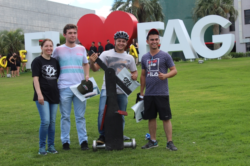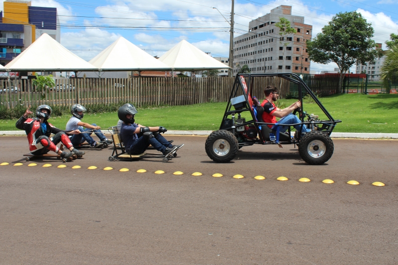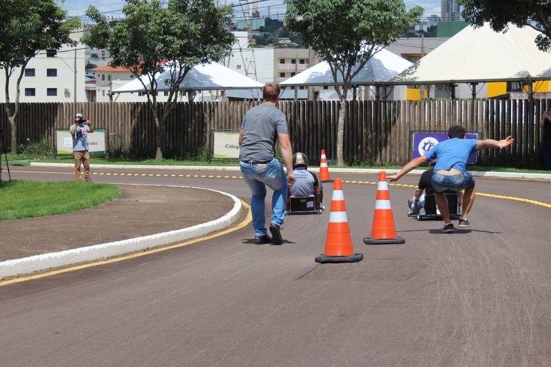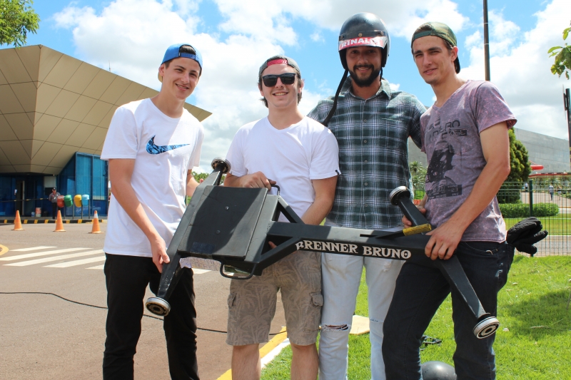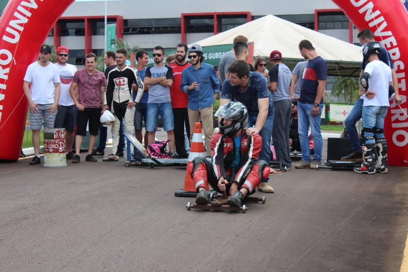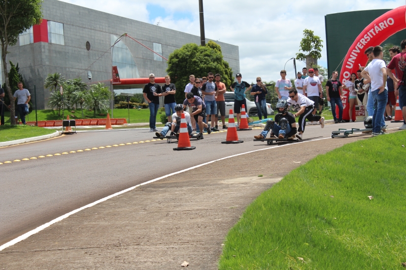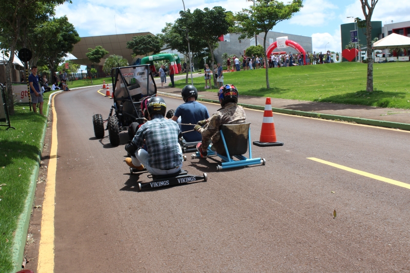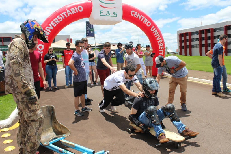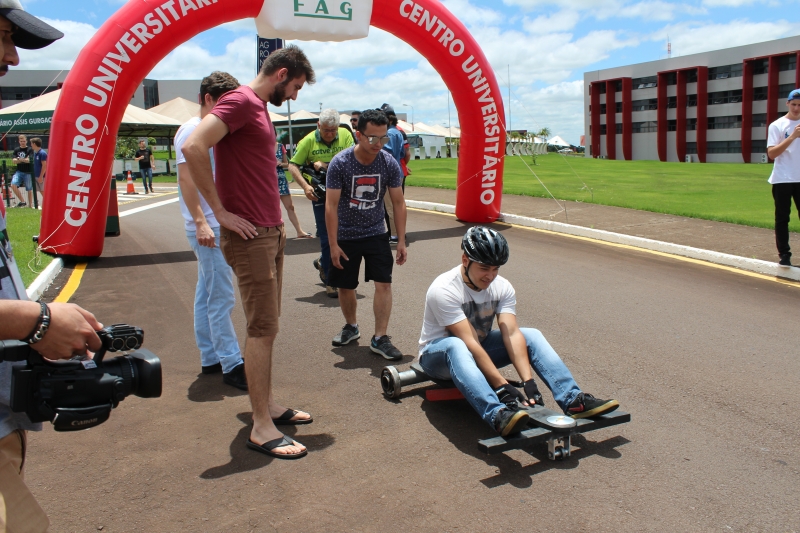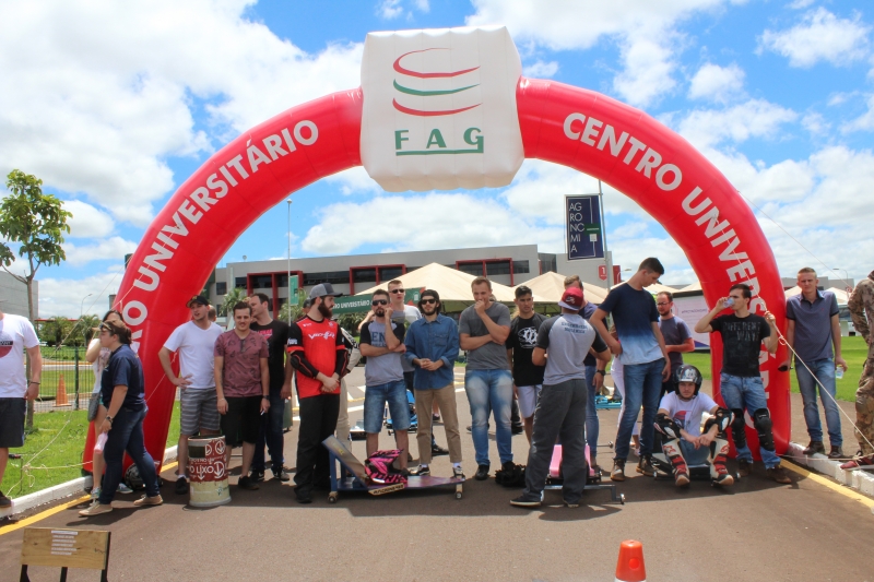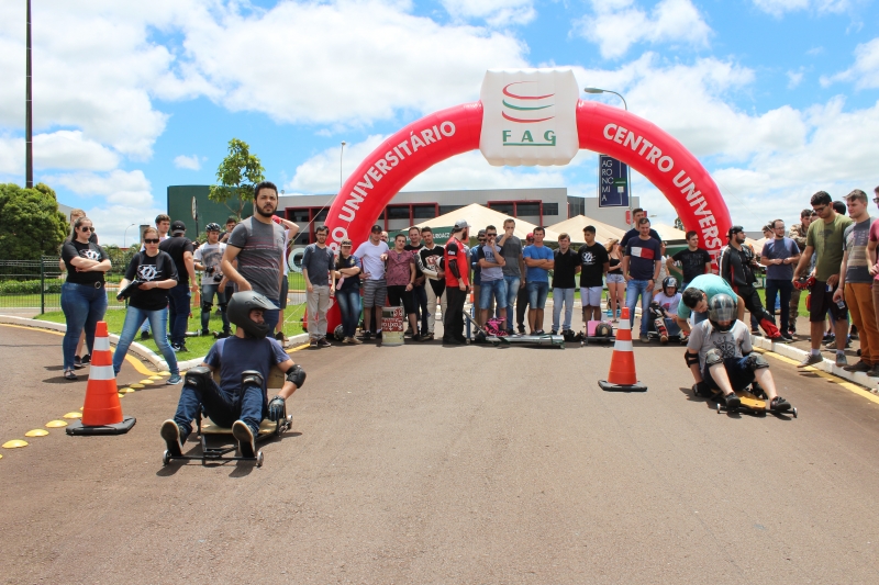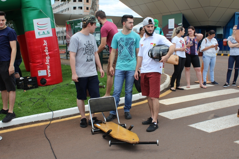 O sábado à tarde foi divertido no campus da FAG. Acadêmicos de Engenharia Mecânica participaram de uma corrida de carrinho de rolimã, no asfalto que dá acesso ao estacionamento do Bloco 4. Eles receberam um desafio: em equipes, tiveram que criar o instrumento utilizado nas brincadeiras antigas e que exige habilidades específicas. Sob a supervisão da professora, Rosemar Dal Ponte, eles fizeram um projeto e desenvolveram o carrinho, que foi apresentado a uma banca avaliadora, para na sequência participar da corrida.