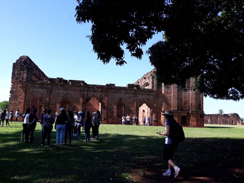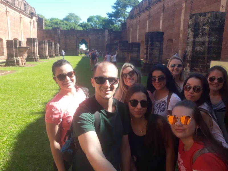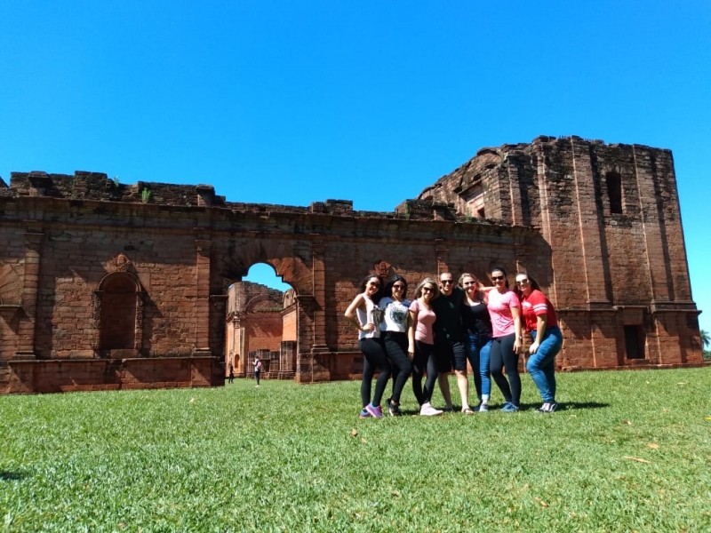 Acadêmicos e professores do curso de Pedagogia da FAG Toledo realizaram uma viagem de estudo especial no último fim de semana. O grupo, acompanhado de professores da Rede Municipal de Ensino, alunos da Pós-Graduação em Docência no Ensino Superior e professoras parcerias da instituição nos projetos de Residência Pedagógica e PIBID saíram na sexta-feira (9) de Toledo rumo à cidade de Jesus de Tavarangue, no Paraguai. Lá os 90 integrantes da caravana participaram de uma visita guiada nas ruinas locais no sábado (10) pela manhã e seguiram viagem até Ruínas de Trinidad. Seguindo o roteiro, o grupo foi para a cidade de Encarnacion, onde visitaram a orla do Rio Paraná na divisa com a Argentina. "A nossa viagem de estudos teve como objetivo possibilitar que acadêmicos de Pedagogia conhecessem o que foram as reduções, o que foi a educação jesuítica e o que significou para os povos indígenas. Nós também conhecemos os conjunto arquitetônico ou o que restou deles. Durante a viagem os alunos refletiram se teria sido diferente a nossa história caso essa educação se perpetuasse para as demais escolas", relata a coordenadora do curso de Pedagogia da FAG Toledo, Dora Pizzo Diniz.