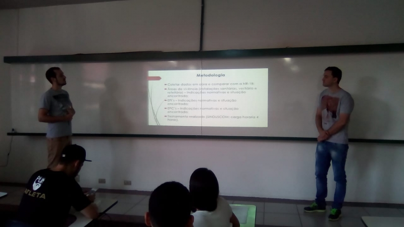 Neste trabalho os acadêmicos relataram suas experiências durante a execução das atividades em canteiros de obras em relação à segurança do trabalho, que inclui os equipamentos de proteção individual (EPI's), equipamentos de proteção coletiva (EPC's) e área de vivência. "A NR 18 é de suma importância para o setor da construção civil. Ela estabelece diretrizes de ordem administrativa, planejamento e segurança nas condições de trabalho na indústria da construção. Essas normas servem para garantir melhores condições de trabalho e medidas de controle e sistemas preventivos de segurança na atividade", cita a professora.