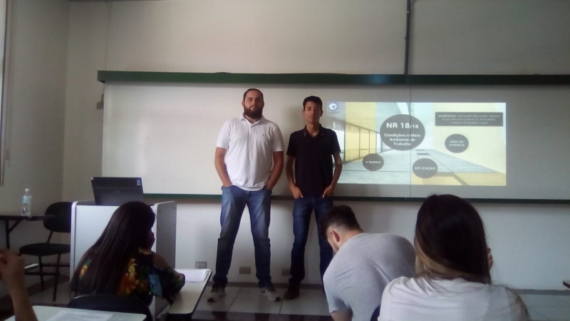 A professora Karina Sanderson Adame, na disciplina de Fundamentos de Engenharia de Segurança do Trabalho, propôs um trabalho aos acadêmicos do 8º período integral do curso de Engenharia Civil referente à NR 18, norma que tem como objetivo prevenir situações que vitimam os trabalhadores diariamente nos diversos setores da construção civil.