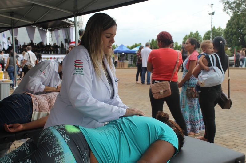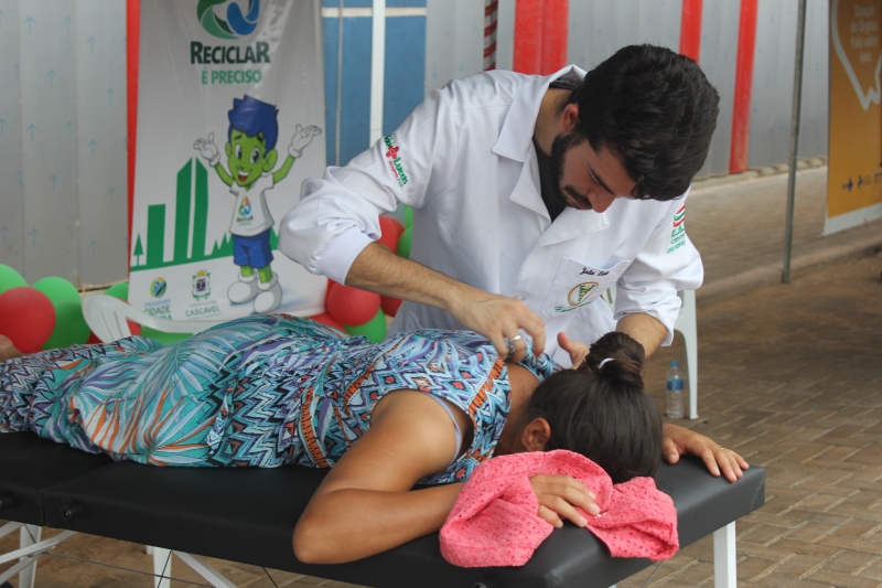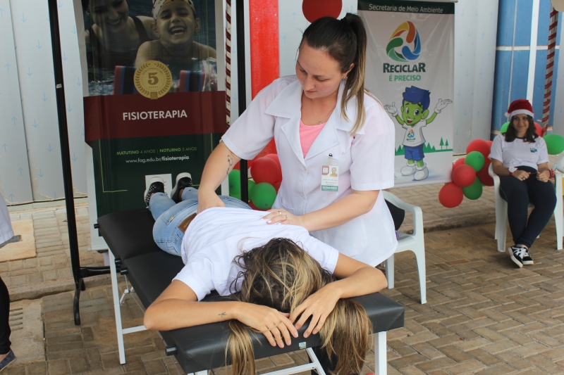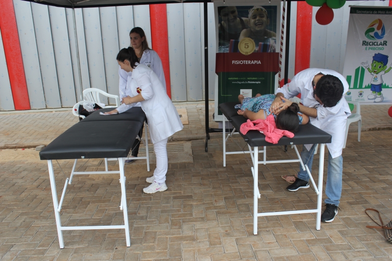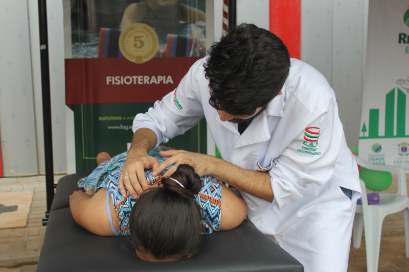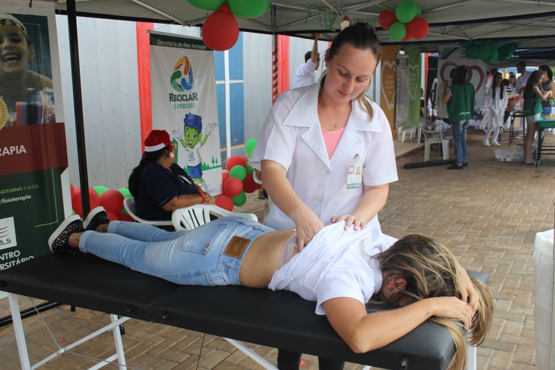 O curso de Fisioterapia marcou presença no evento com Terapias Manuais. Acompanhados da professora, Lizyana Vieira, os acadêmicos ofereceram atendimento à população. "Viemos mostrar um pouco da área de atuação da Fisioterapia. Fizemos liberação de músculos, alongamentos e mobilizações para aliviar a dor e aumentar o bem-estar do paciente", conta a professora. Cristina Pinto passou pelo evento e aproveitou o serviço gratuito. "Estava com dor nas costas e vim aqui para eles me ajudarem. Gostei bastante". elogia.
