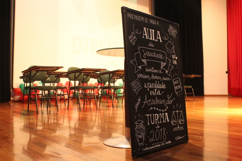 Formandos do curso de Direito, Matutino e Noturno, compareceram para a ?Aula da Saudade?. O evento foi organizado, assim como nos outros anos, pelo professor Josnei Oliveira da Silva, e realizado no Anfiteatro da Reitoria. Professores, familiares e amigos também estiveram presentes e compartilharam momentos de emoções. O evento contou com depoimentos feitos pelos familiares, apresentações dos professores e homenagens dos formandos ao colegiado.