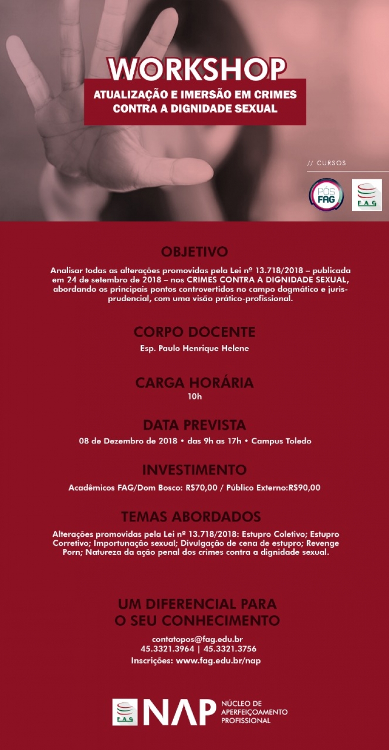 O Núcleo de Aperfeiçoamento Profissional (NAP) do Centro FAG realiza no próximo sábado (8) na FAG Toledo o workshop ?Atualização e Imersão em Crimes Contra a Dignidade Sexual?. A capacitação será realizada pelo especialista Paulo Henrique Heleno que vai trabalhar uma análise sobre as alterações promovidas pela Lei 13.718/2018 que foi publicada em setembro deste ano. A lei trata dos crimes contra a dignidade sexual e o workshop vai trabalhar com os principais pontos controvertidos no campo dogmático e jurisprudencial com uma visão prático-profissional.