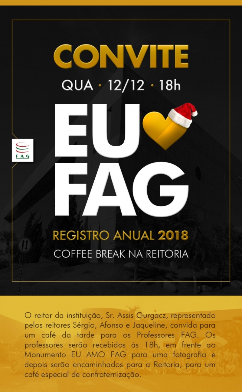 Para um momento de confraternização, o Reitor do Centro Universitário FAG, Seo Assis Gurgacz, representado pelos reitores Sérgio De Angélis, Afonso Cavalheiro Neto e Jaqueline Gurgacz Ferreira, convida todos os professores da instituição para um Café da Tarde. O evento acontece nesta quarta-feira (12), às 18h.