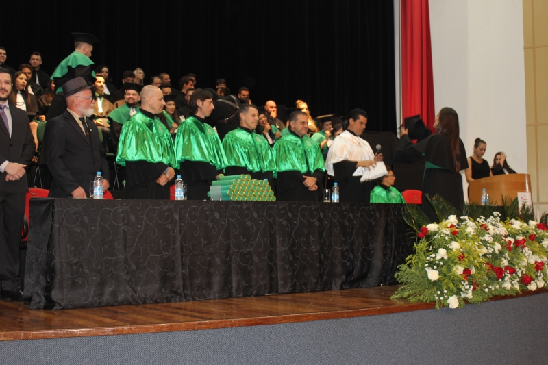 A mesa dos trabalhos foi composta pelo presidente da sessão, o Pró-reitor Acadêmico, Afonso Cavalheiro Neto, pela secretária acadêmica, Maria Madalena, pelo coordenador do curso, Vitor Cesar Moreira e, pelos professores homenageados: prfº. Everton Paulo Roman; prfº. Gleison Miguel Lissemerki Ferreira; profº. Lissandro Moisés Dorst; prof. Jorge Luiz de Mendonça Ortellado Alderete; prof. Hani Zehdi Amine Awad.