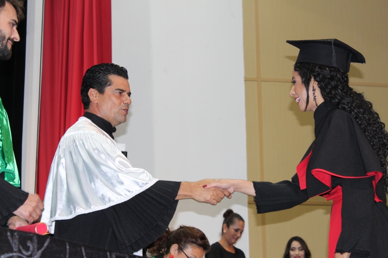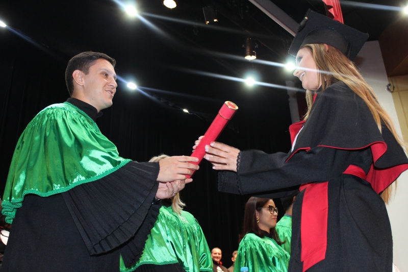 A coordenadora, Viviana Bianconi, fez a entrega da láurea acadêmica ao formado, Fabrício Dzierva, que obteve a maior média de notas no curso.