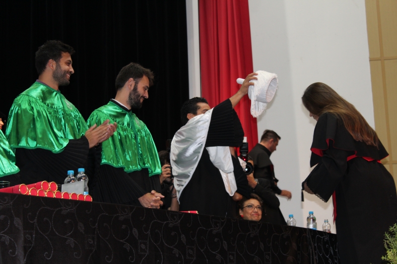 A mesa de honra foi composta pelo presidente da sessão, pela secretária acadêmica, Maria Madalena de Camargo, pela coordenadora do curso, Viviana Bianconi e pelos professores homenageados: Eduardo Hoffmann; Tiago Vidal Vieira; Marcella Cristina Brazão Silva e Lucas Henrique Fávero.