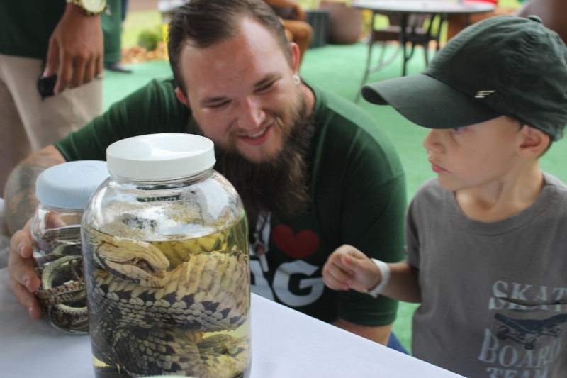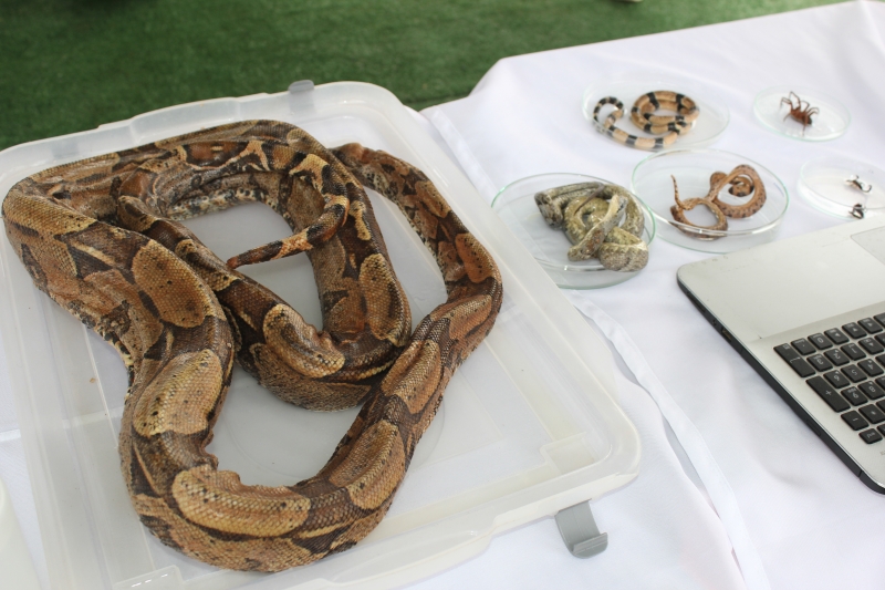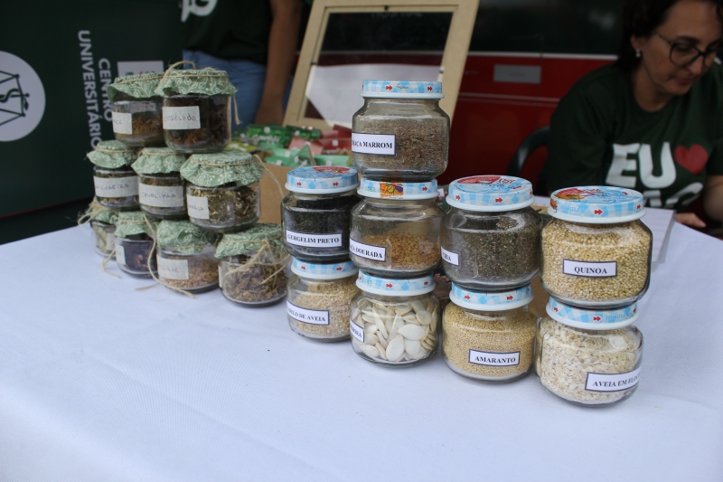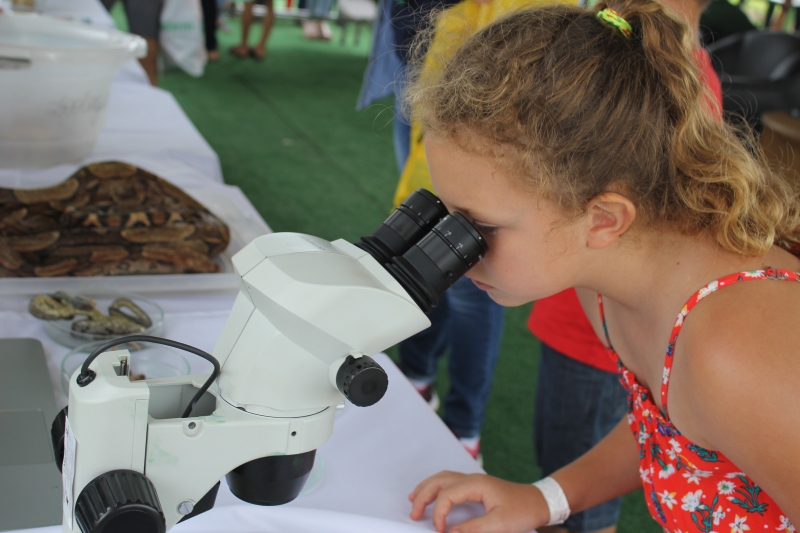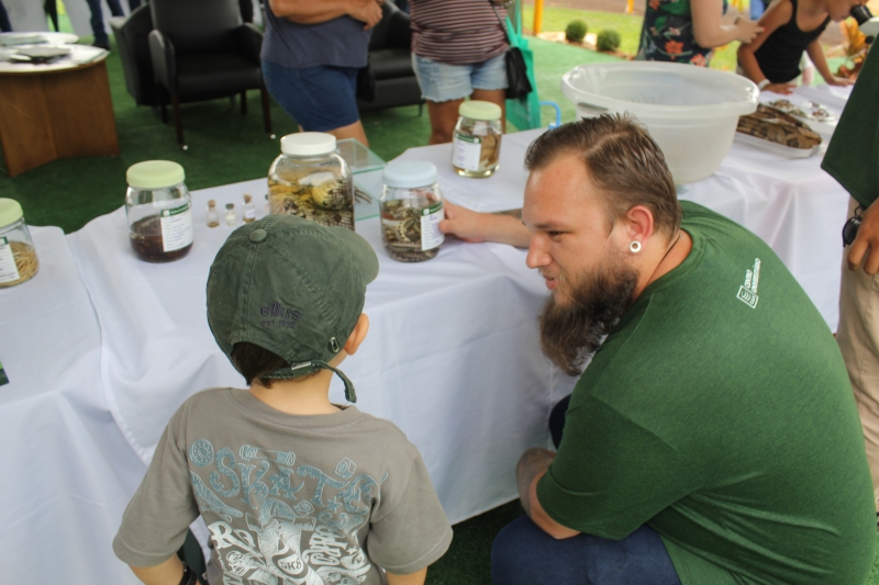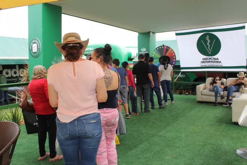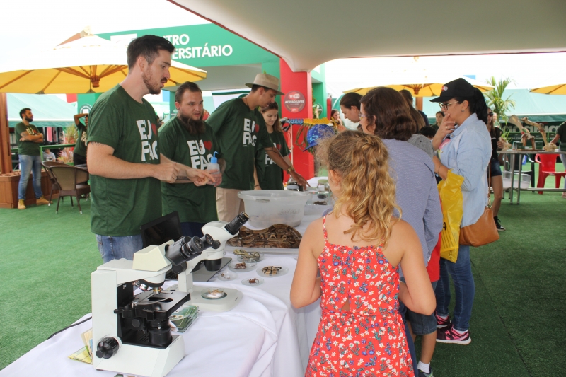 O curso de Agronomia trouxe ao evento um insetário e explicações sobre o controle biológico de pragas nas plantações. Medicina Veterinária está fazendo demonstrações com algumas partes de animais, como esqueleto. Atentos, os participantes ouvem as orientações de professores e acadêmicos.