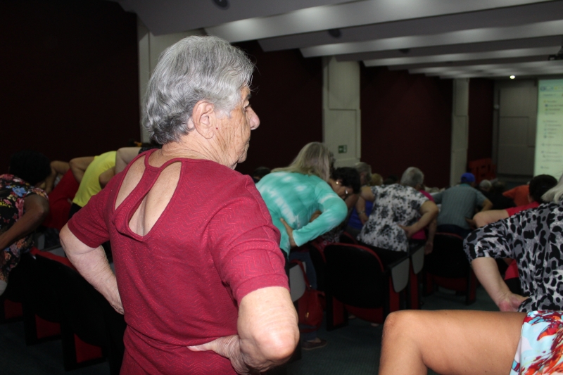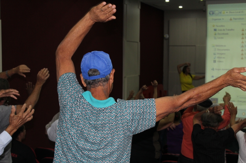 Os idosos já iniciaram o ano com agitação: eles participaram de brincadeiras e de alongamentos cheios de animação.
