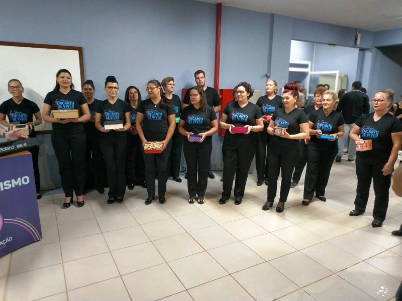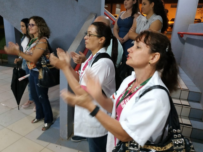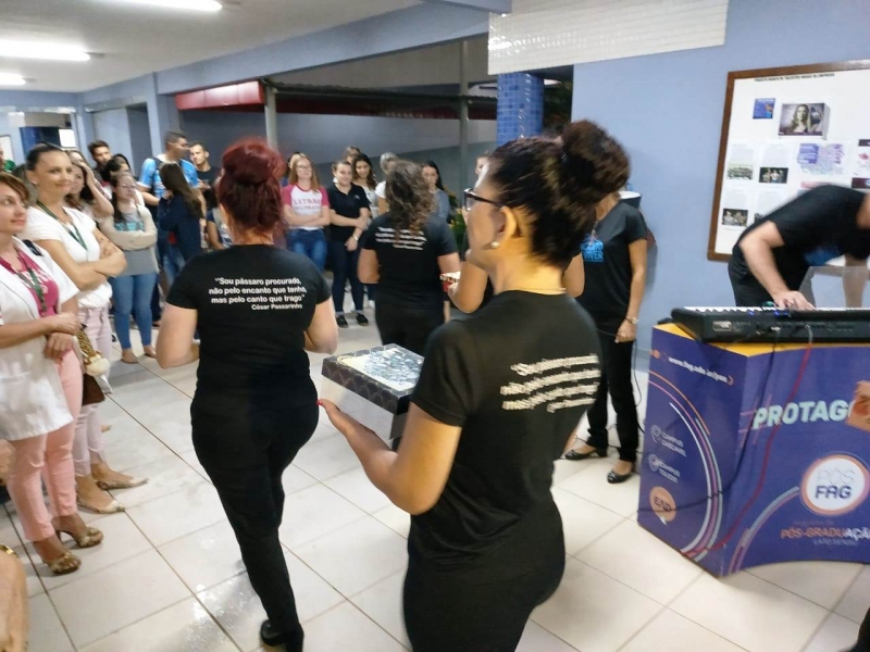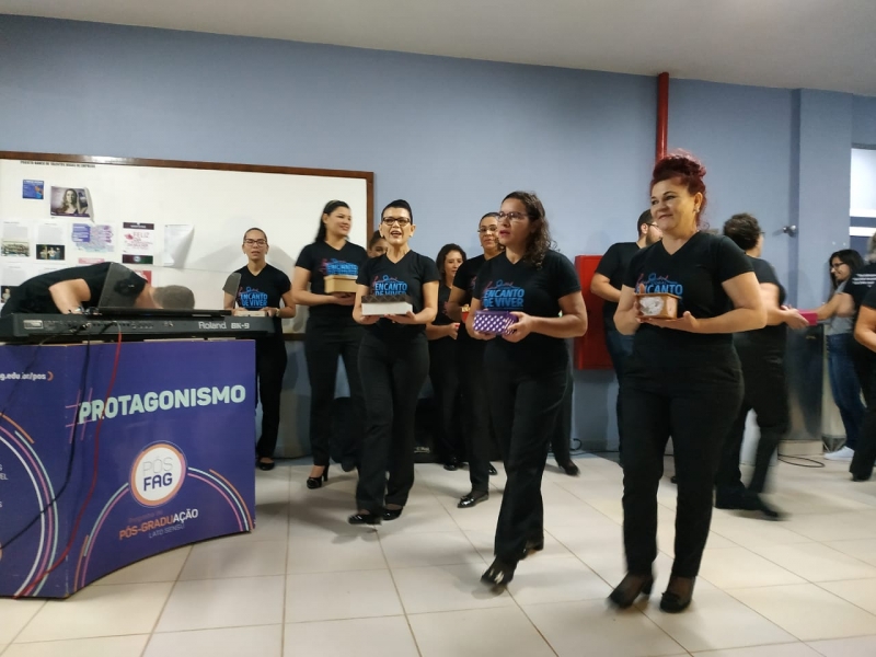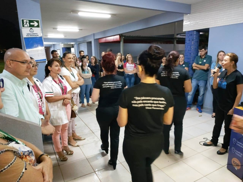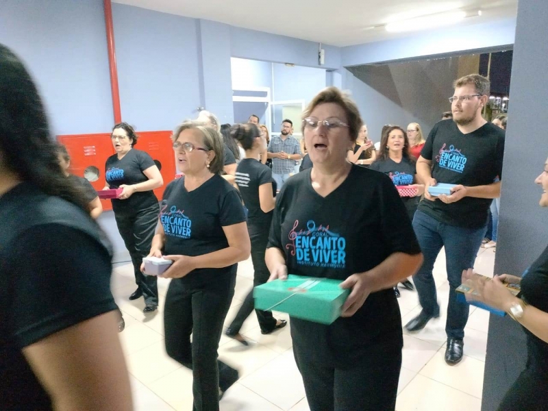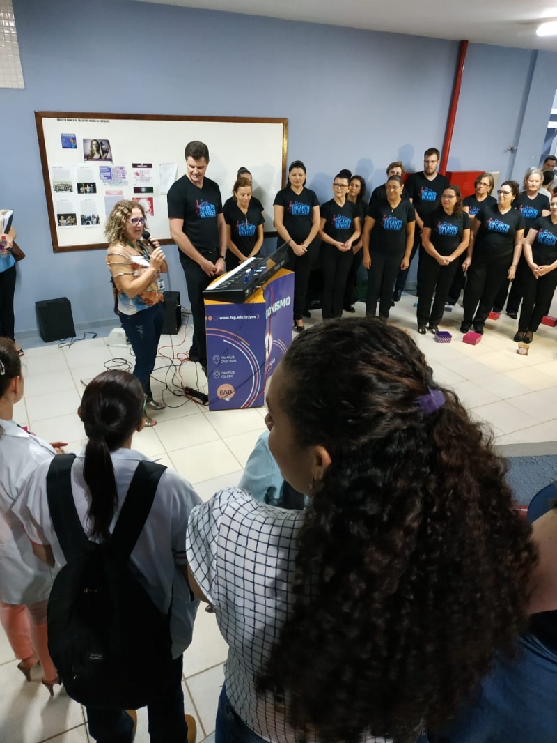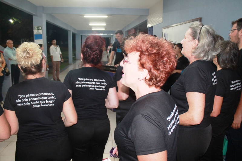 Uma apresentação inusitada, no meio do saguão que interliga os blocos II e III da FAG Toledo despertou a atenção e a curiosidade dos acadêmicos que passaram pelo local na noite de sexta-feira (8). O "Coral Encanto de Viver" fez uma apresentação especial e rápida, pouco antes do início das aulas, cativando professores e estudantes da instituição. O coral é formado por mulheres de Toledo que já trataram ou estão em tratamento de algum tipo de câncer. Histórias de superação que viraram vozes, no coral regido pelo mastro Nelson Engelmann. "Nós trouxemos esta apresentação nesta noite do Dia Internacional da Mulher, como um presente para as acadêmicas e professoras da FAG. Temos uma história de luta marcando a vida de cada uma das integrantes e o nosso objetivo é unir estas mulheres, trabalhando a autoestima, a socialização delas e a superação deste trauma que é estar com câncer, fazendo tudo isto virar arte através da música", explica Engelmann.