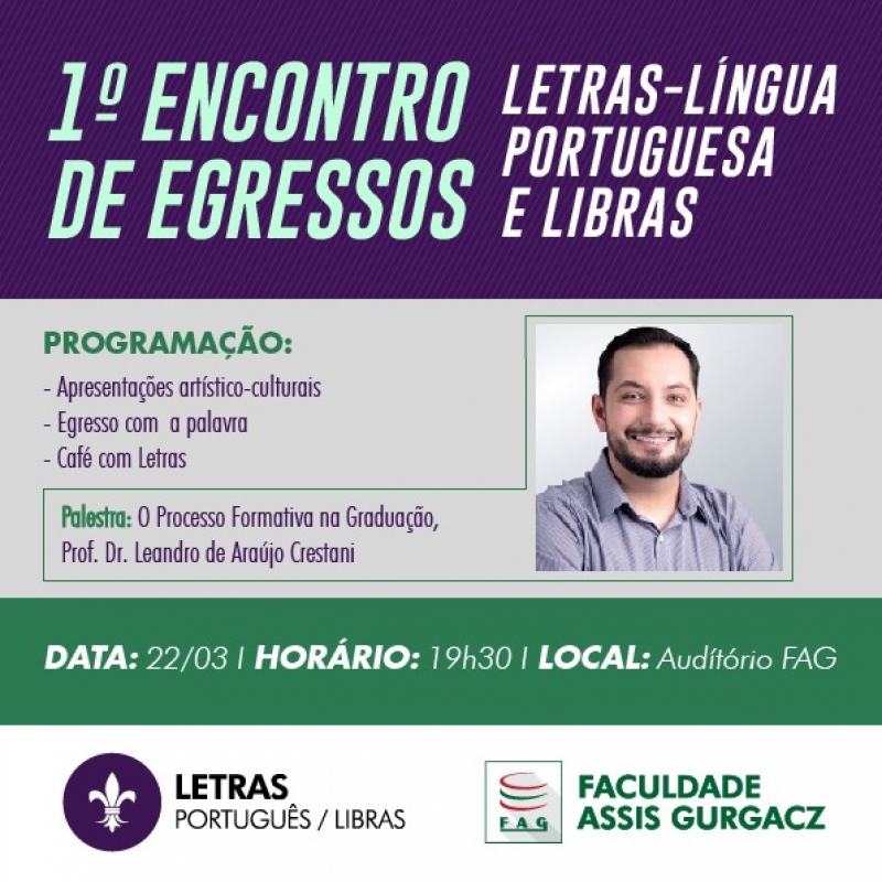 O curso de Letras Língua Portuguesa e Libras da FAG Toledo realiza na próxima semana o 1º Encontro de Egressos da instituição. O evento será no dia 22 de março no auditório da instituição e contará com apresentações culturais, fala de alunos formados no curso e o Café com Letras. O palestrante da noite será o professor Leandro Crestani, que pretende levar aos acadêmicos uma reflexão sobre a universidade e o mercado de trabalho. "Vamos falar da importância de se dedicar durante o período de estudos, de forma sistematizada, pensando na carreira acadêmica que inicia na graduação e passa pelas especializações, mestrado e doutorado, sempre com foco no contexto contemporâneo, pensando a teoria e a prática, ou seja, se aquilo que foi visto na universidade realmente se efetiva na prática", relaciona.