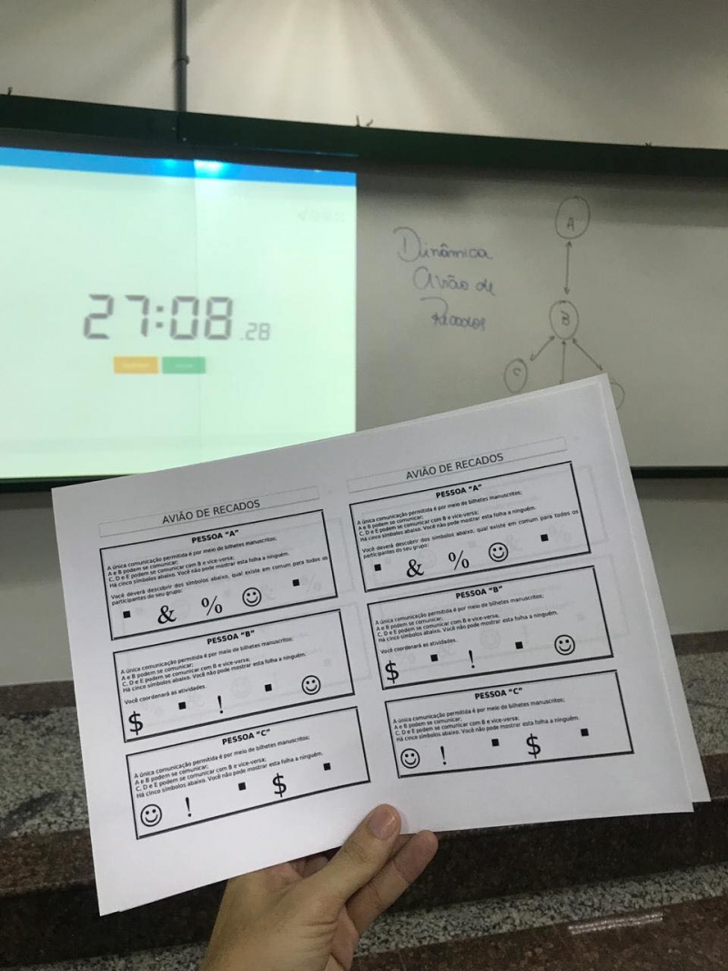O professor da disciplina de Administração Mercadológica, do curso de Administração do Centro Universitário FAG, Guilherme Traesel, foi além da teoria com os ensinamentos de fluxo de comunicação. Para fazer com que os alunos entendessem na prática como se dá e quais são as dificuldades da comunicação, ele trouxe aos alunos a dinâmica chamada "Avião de Recados".