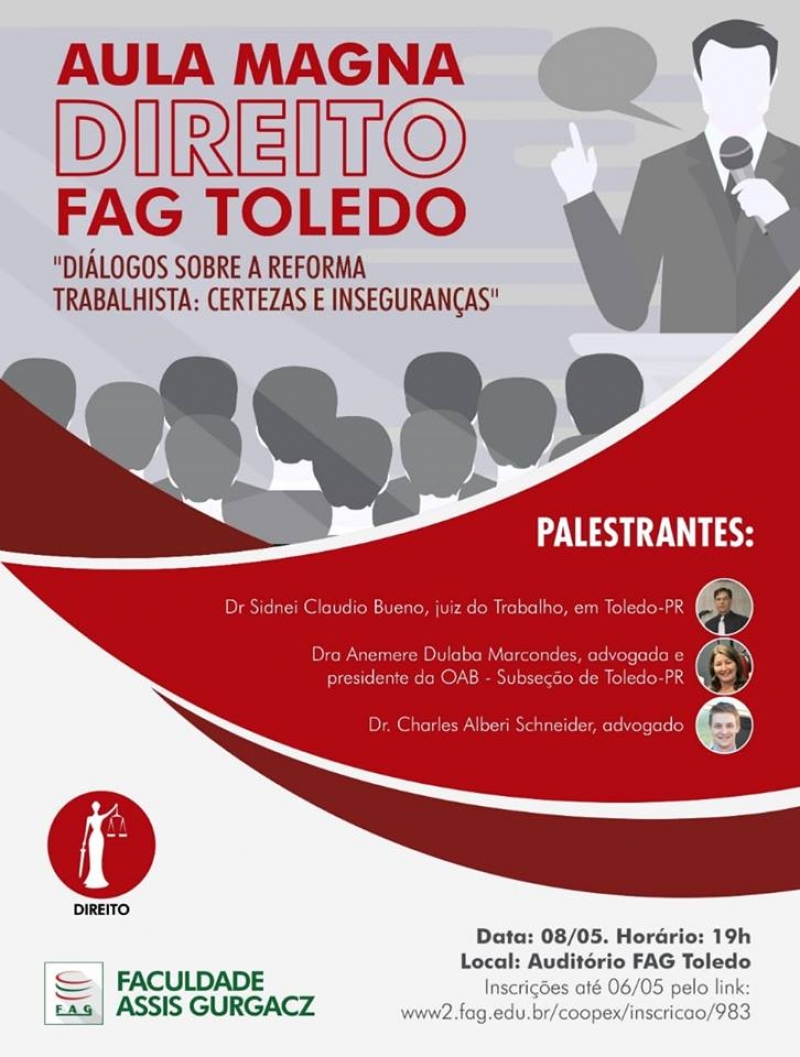O curso de Direito da FAG Toledo realiza no próximo dia 8 de maio a Aula Magna que será uma mesa redonda sobre a reforma trabalhista que completa dois anos de vigência em 2019. A discussão vai contar com a participação do juiz da Justiça do Trabalho Sidnei Claudio Bueno e dos advogados Anemere Dulaba Marcondes e Charles Alberi Schneider. "É um evento pensado por uma comissão composta por alunos, docentes e profissionais do Direito, incluindo os palestrantes que conhecem de forma profunda a mudança da legislação e lidam com as alterações na prática profissional", explica a coordenadora do curso de Direito, Camila Ricci.