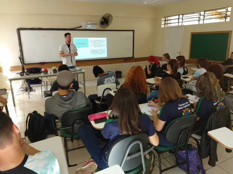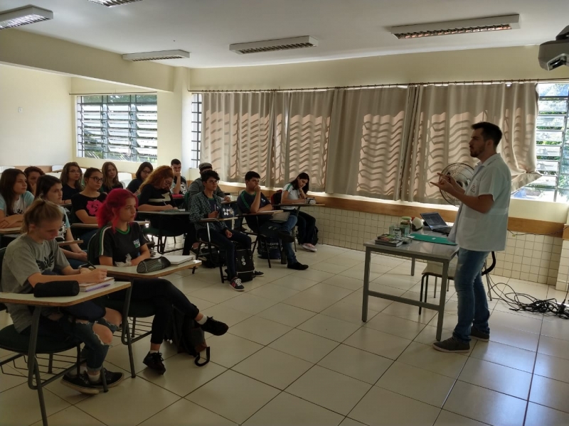 O Coordenador de Ciências Biológicas do Centro Universitário FAG, Juliano Karvat, realizou um bate-papo sobre o trabalho do biólogo com os alunos de Meio Ambiente do Colégio CEEP, em Cascavel.