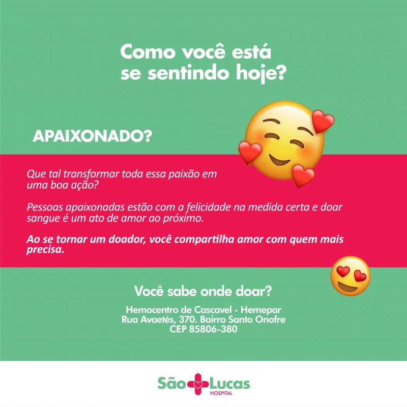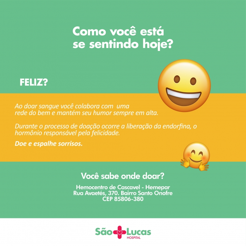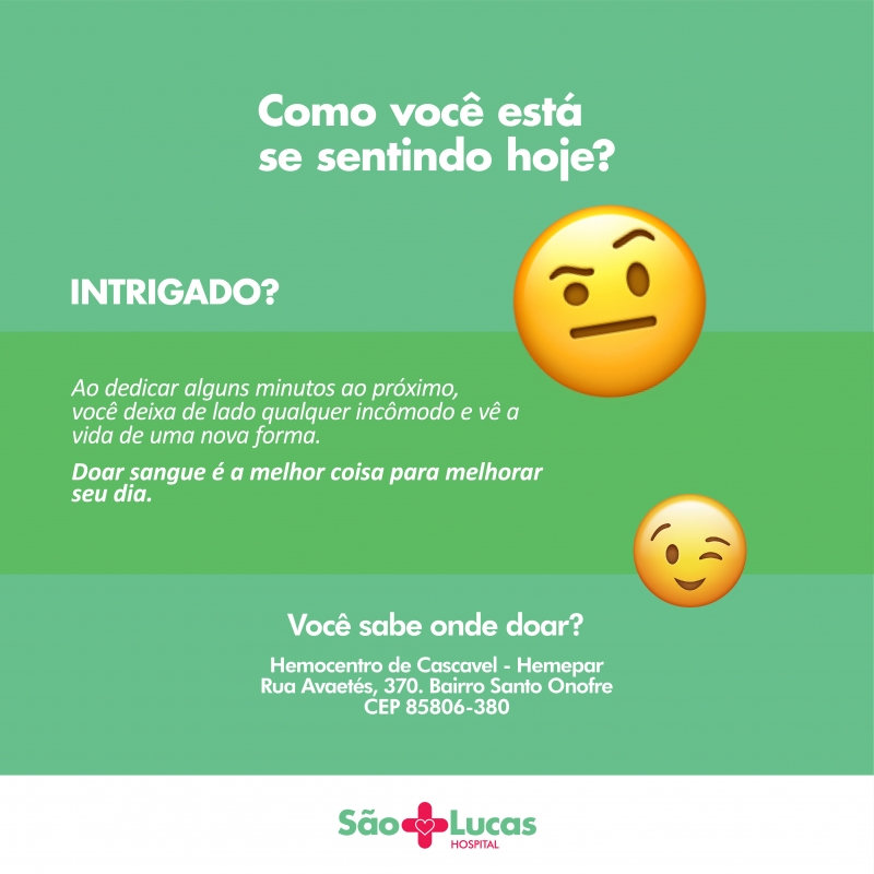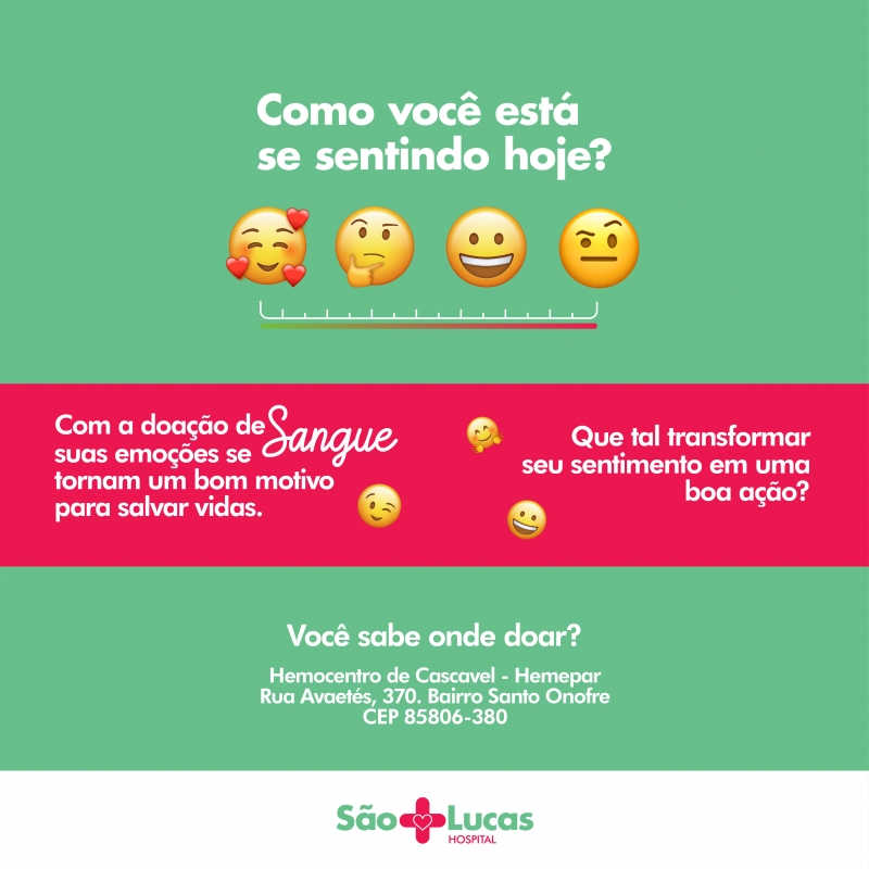 Para estimular a doação consciente, a Fundação Hospitalar São Lucas criou uma campanha que aponta motivos baseados em como a pessoa está se sentindo e em o que ser um doador pode se relacionar com isso. "Normalmente, o que se vê em torno de campanhas de doação de sangue, é um apelo emocional para salvar a vida de alguém. Nossa ideia foi quebrar esse paradigma e mostrar que o ato da doação é algo que faz bem tanto pra quem doa, quanto para quem vai receber e que, inserir isso na nossa rotina como uma prática constante, é tão simples como qualquer outra ação do nosso dia a dia", conta Celina Albertassi, do Marketing da instituição.