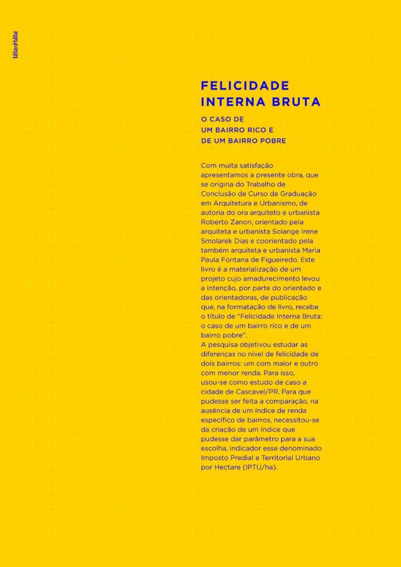 "Felicidade Interna Bruta: o caso do bairro rico e de um bairro pobre" é o título da obra recém-lançada pelos egressos do curso de Arquitetura e Urbanismo do Centro Universitário FAG, Roberto Zanon e Maria Paula Fontana de Figueiredo, e pela Coordenadora da graduação, Solange Irene Smolarek Dias. A obra é fruto da monografia de Roberto, tendo como orientadoras Solange e Maria Paula.