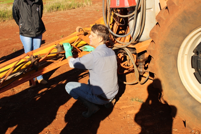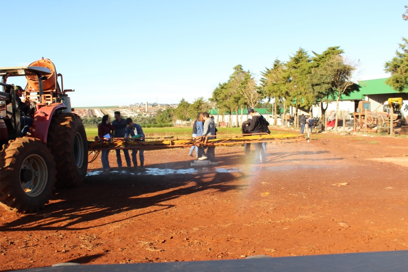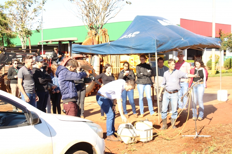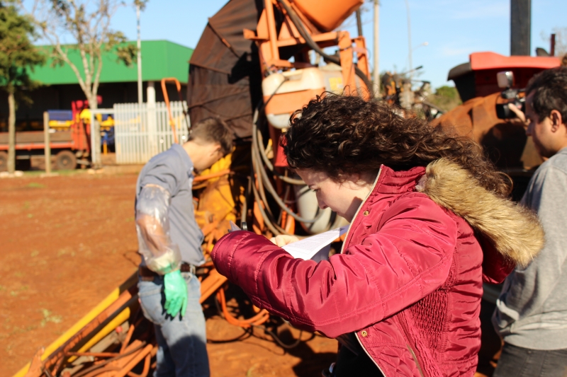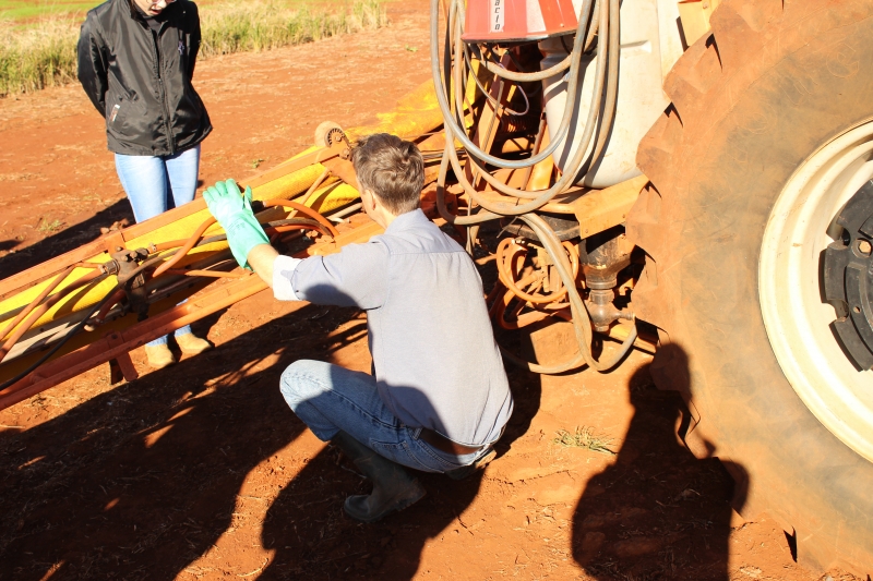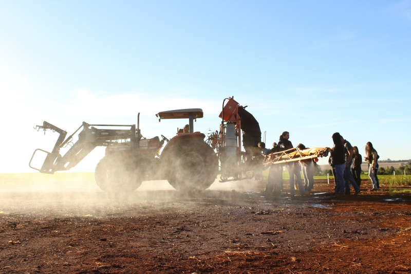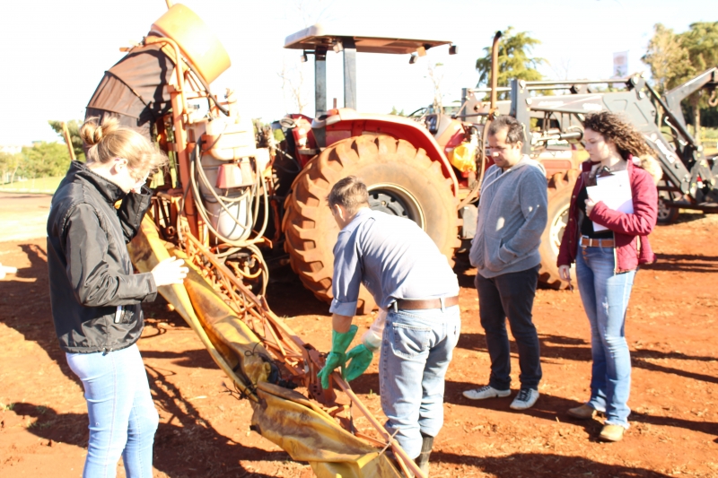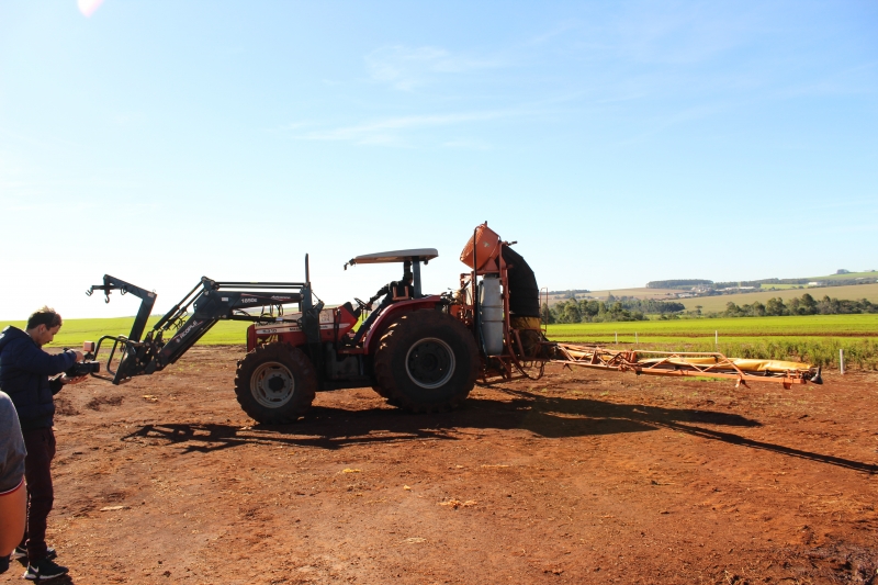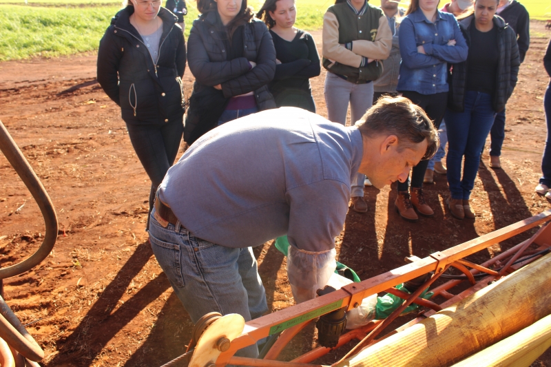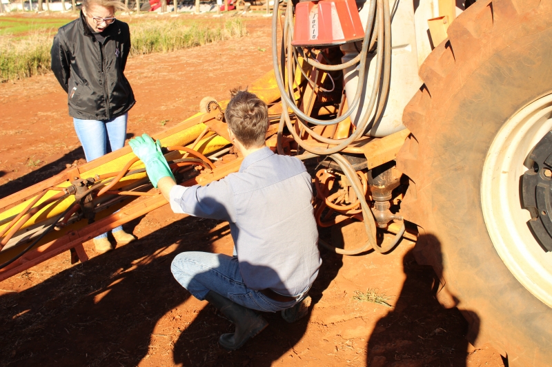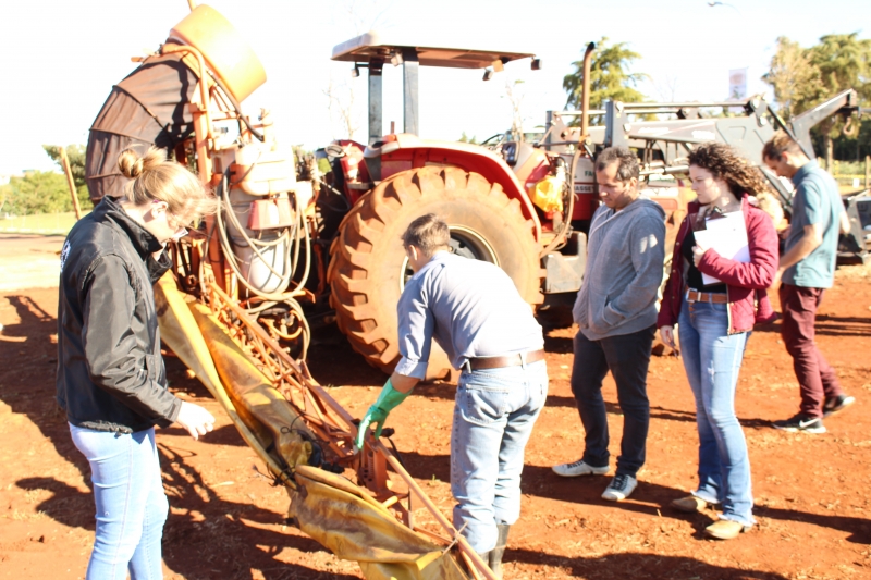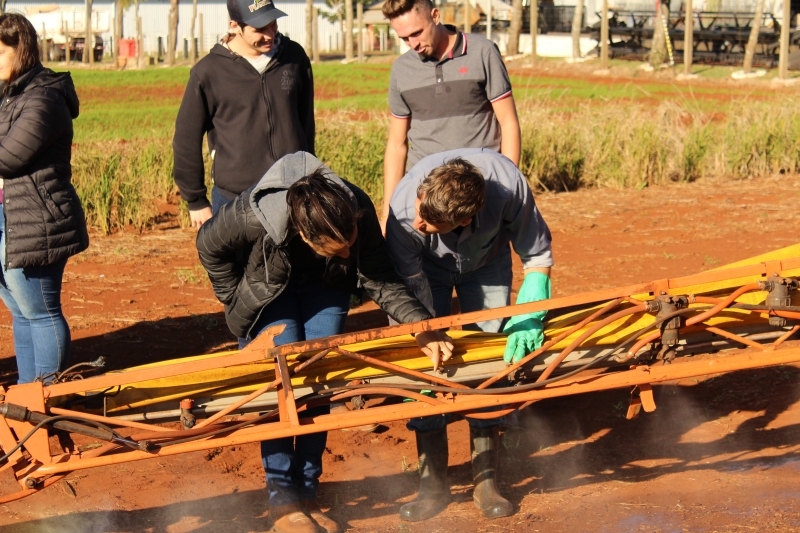 Eduardo falou sobre a inoculação de sementes - introdução de bactérias fixadoras de nutrientes no solo. Houve uma explicação e, em seguida, uma demonstração. Cristiano fez uma breve fala sobre a inspeção de pulverizadores e seguiu para uma atividade prática de inspeção. Os acadêmicos participaram da vistoria de um trator com 14m de barras - 28 pontas a serem inspecionadas. O processo foi executado pelo profissional e auxiliado pelos acadêmicos, com explicações sobre o procedimento. Os alunos tiveram espaço para perguntar, tirar dúvidas sobre a prática.