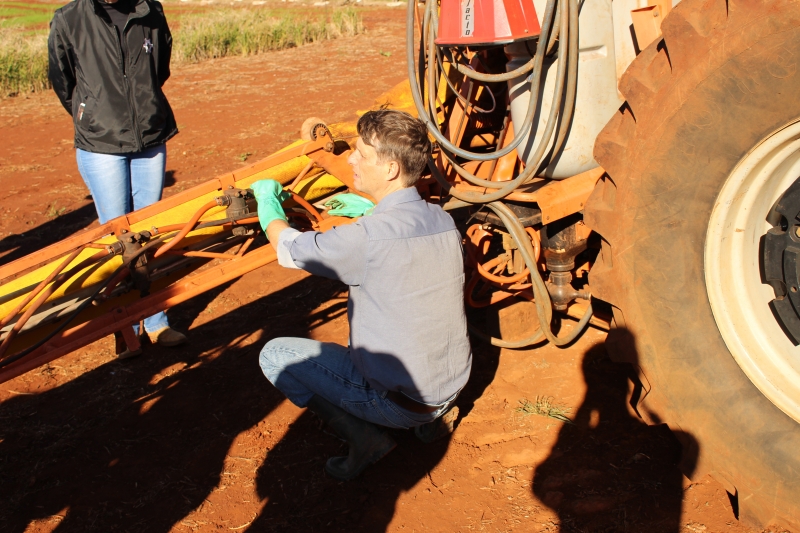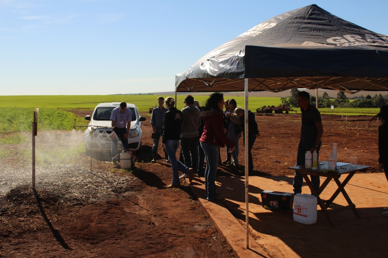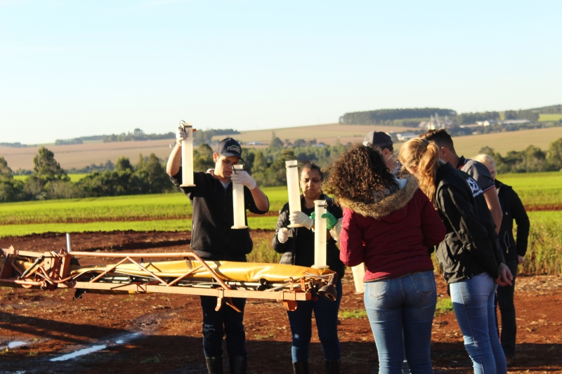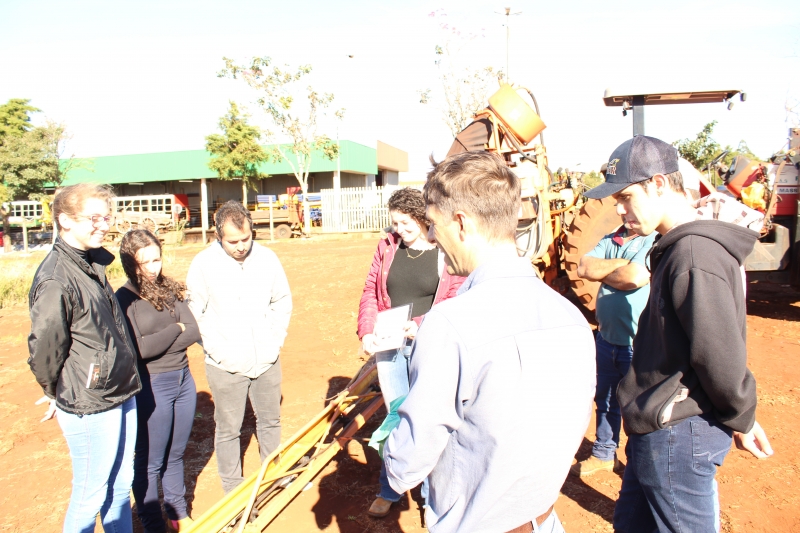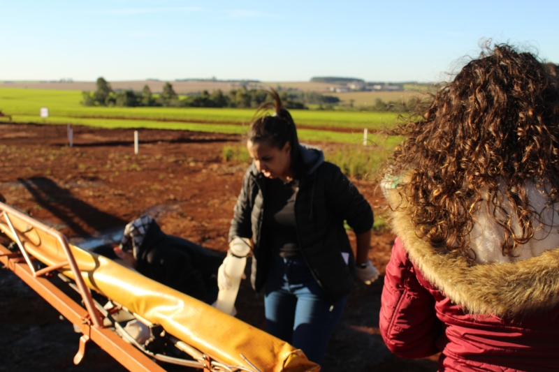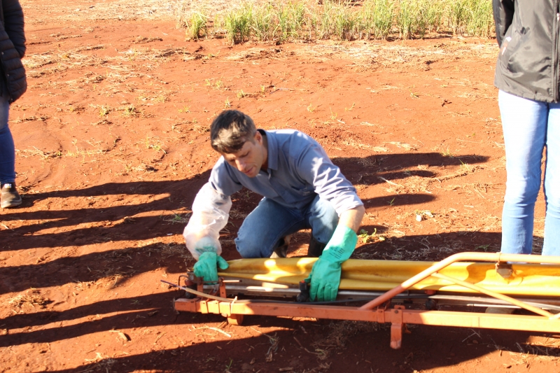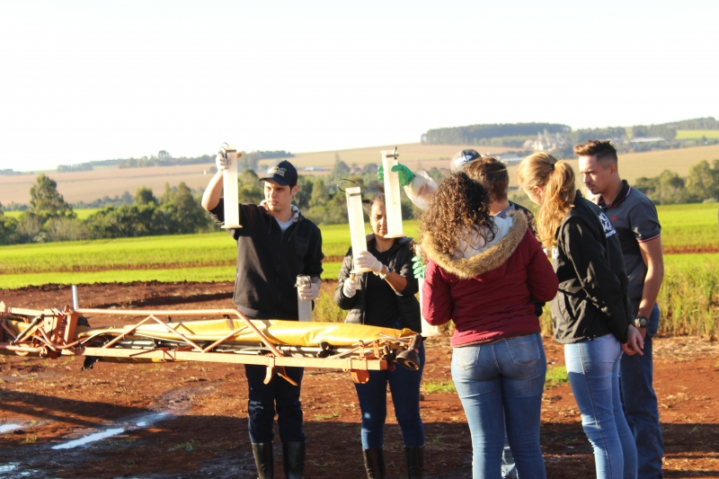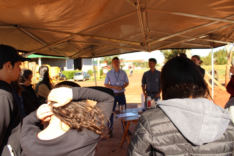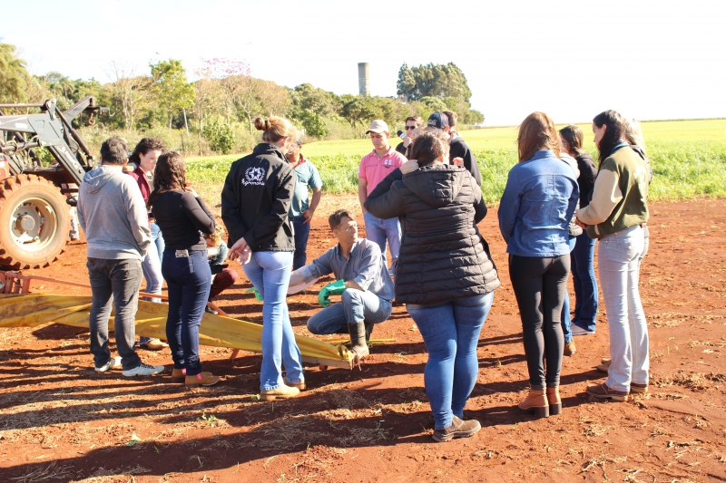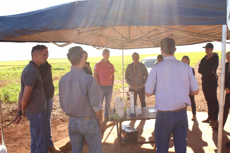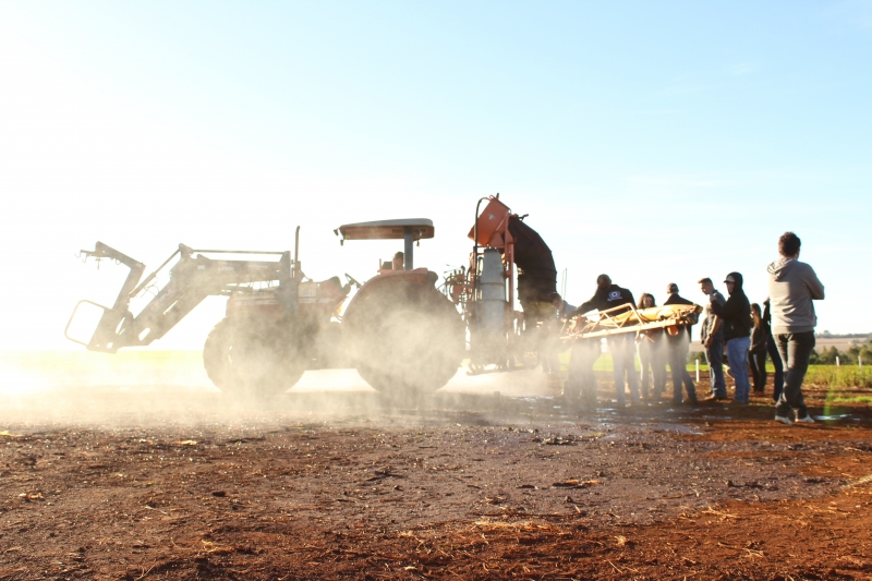Eduardo falou sobre a inoculação de sementes - introdução de bactérias fixadoras de nutrientes no solo. Houve uma explicação e, em seguida, uma demonstração. Cristiano fez uma breve fala sobre a inspeção de pulverizadores e seguiu para uma atividade prática de inspeção. Os acadêmicos participaram da vistoria de um trator com 14m de barras - 28 pontas a serem inspecionadas. O processo foi executado pelo profissional e auxiliado pelos acadêmicos, com explicações sobre o procedimento. Os alunos tiveram espaço para perguntar, tirar dúvidas sobre a prática.