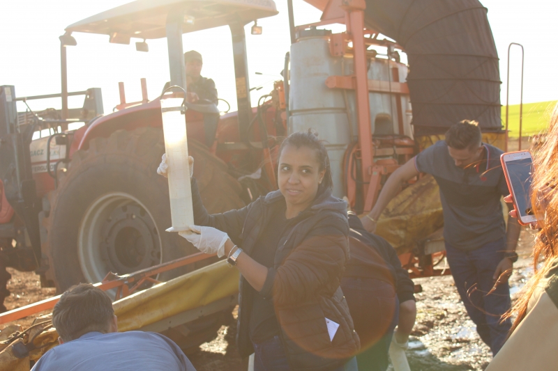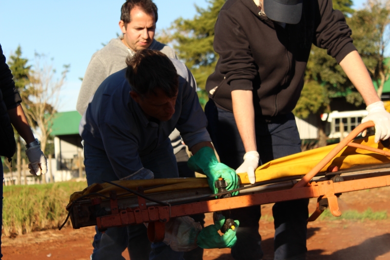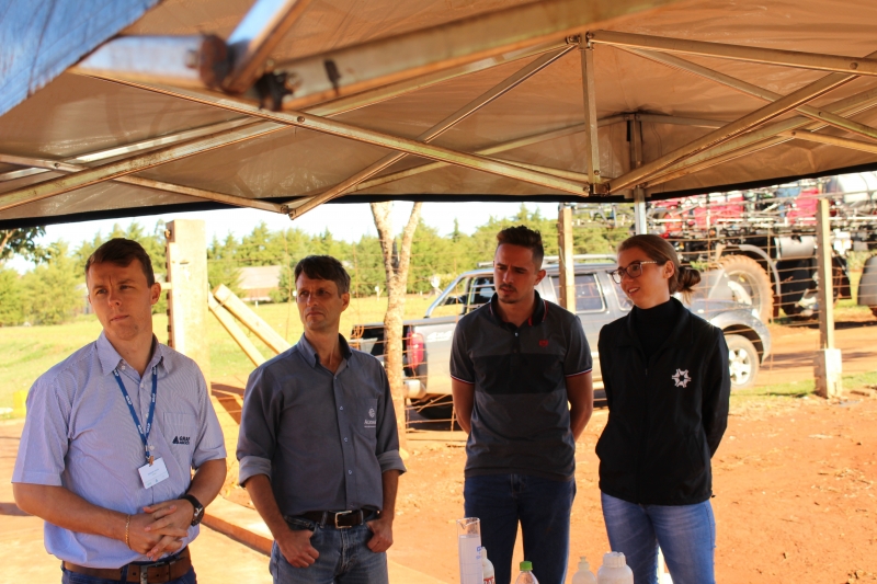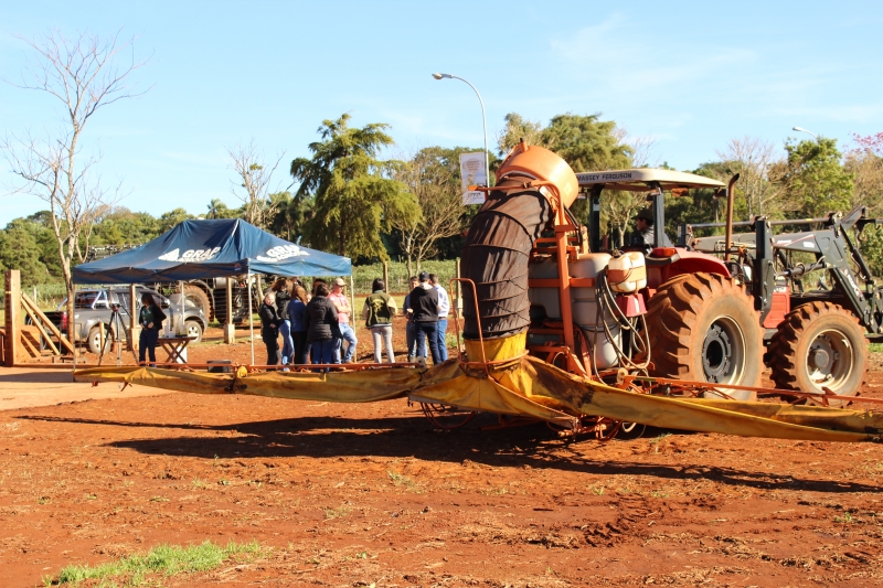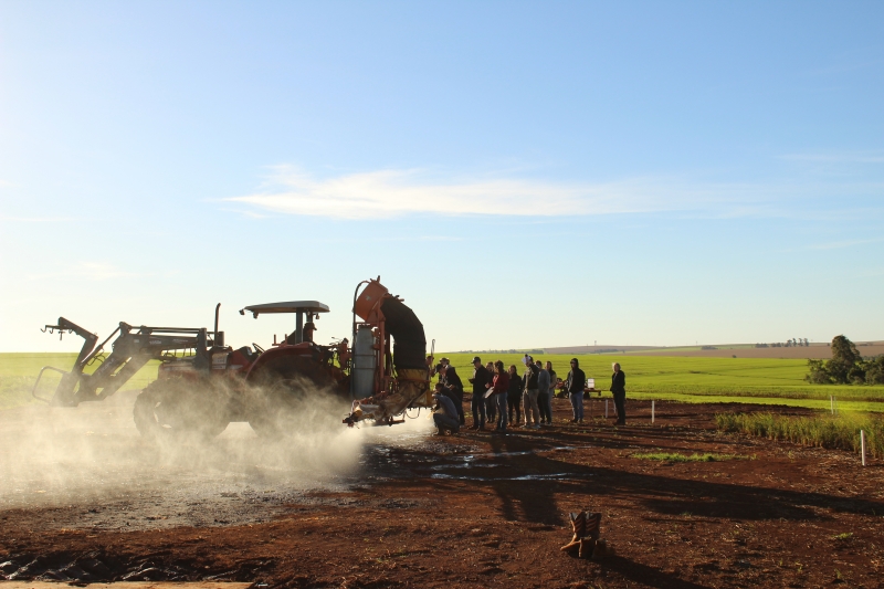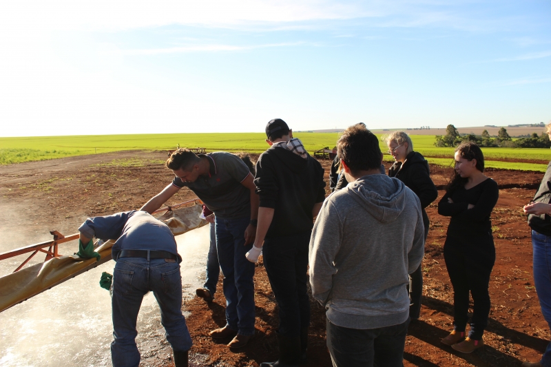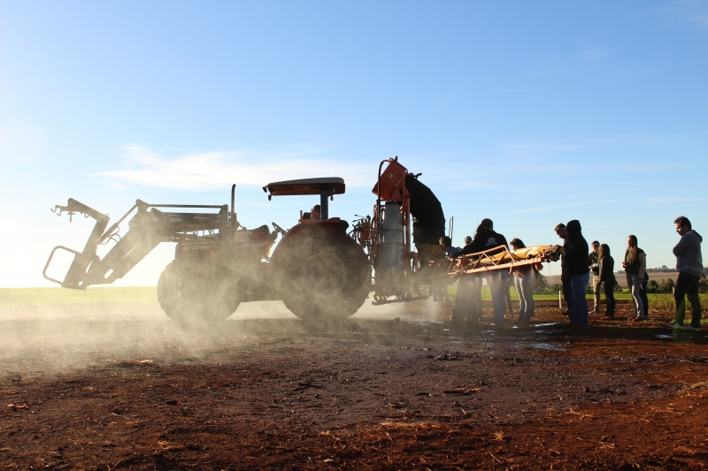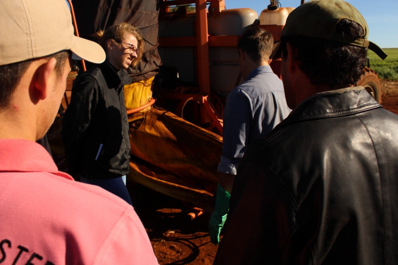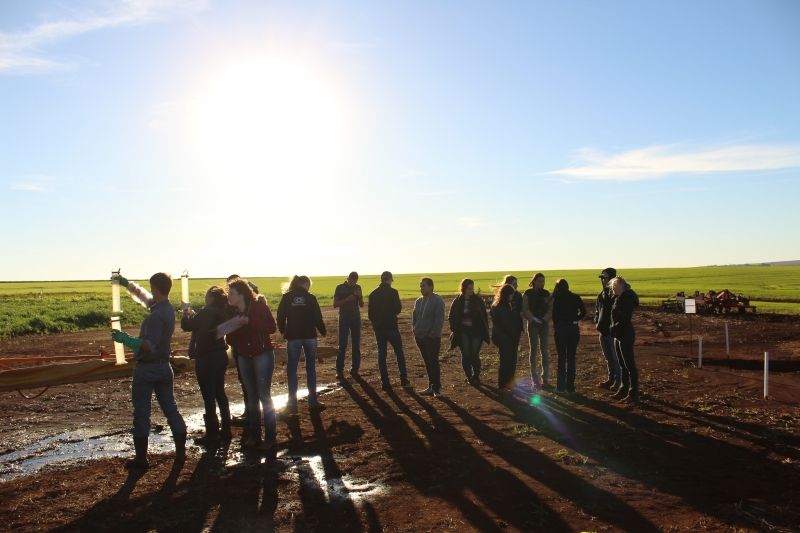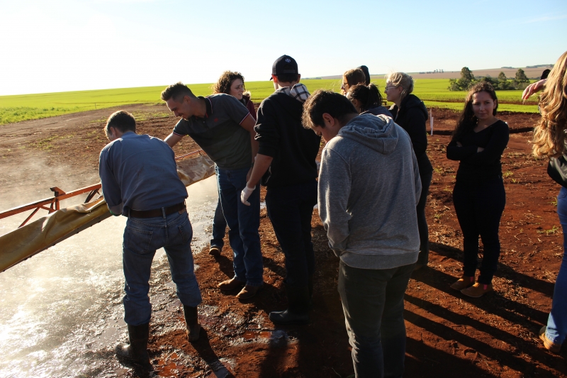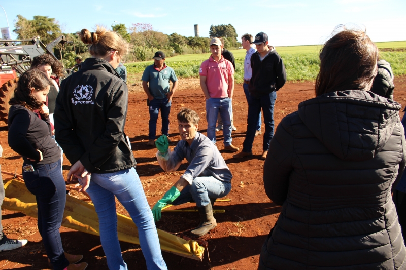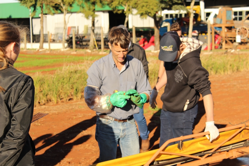Eduardo falou sobre a inoculação de sementes - introdução de bactérias fixadoras de nutrientes no solo. Houve uma explicação e, em seguida, uma demonstração. Cristiano fez uma breve fala sobre a inspeção de pulverizadores e seguiu para uma atividade prática de inspeção. Os acadêmicos participaram da vistoria de um trator com 14m de barras - 28 pontas a serem inspecionadas. O processo foi executado pelo profissional e auxiliado pelos acadêmicos, com explicações sobre o procedimento. Os alunos tiveram espaço para perguntar, tirar dúvidas sobre a prática.