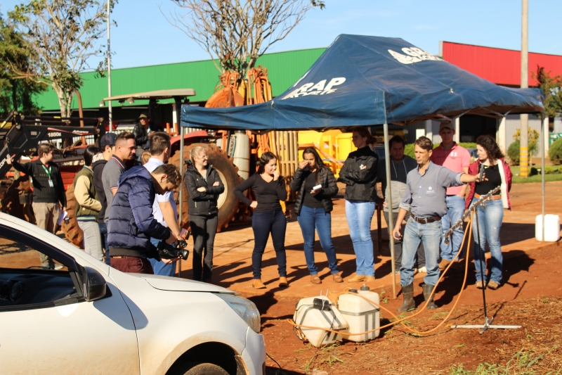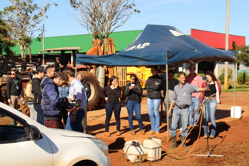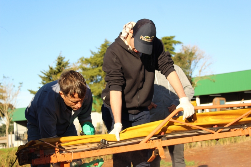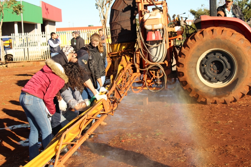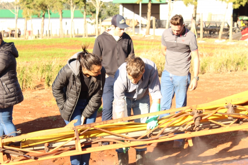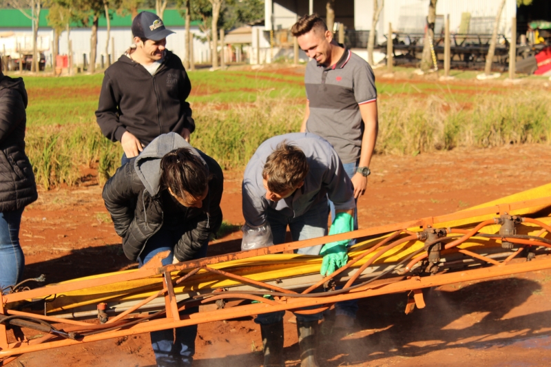 Acadêmicos de Agronomia do Centro Universitário FAG, que realizam Estágio na Fazenda Escola, participaram de um minicurso sobre inoculação de sementes e inspeção de pulverizadores. Cristiano Machado, proprietário da Agrimax, e Eduardo Vuicik, representante da Agrocete-GRAP - formado em Agronomia pela FAG -, coordenaram as atividades.
