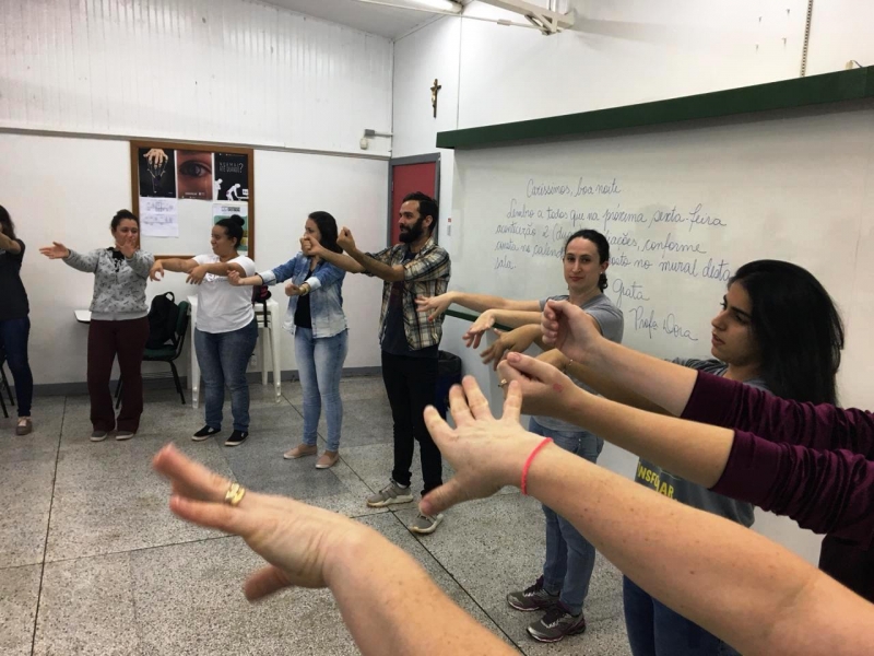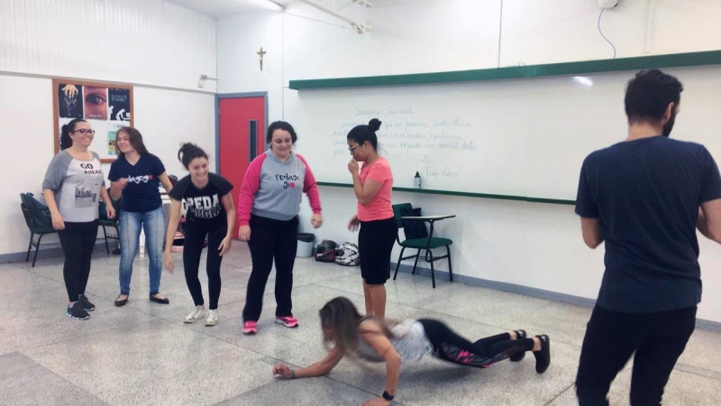 Os acadêmicos do 3º período do curso de Pedagogia da FAG Toledo participaram de uma oficina sobre técnicas teatrais durante a disciplina de "Produção de Recursos Pedagógicos", ministrada pela professora Keili Rocha. O projeto "O teatro como ferramenta no processo de formação de professores" foi realizado pelo professor Marcelo Oliveira, que trabalhou técnicas teatrais com a turma de forma dinâmica com atividades de expressão corporal e comunicação. "A ideia é buscar redescobrir e ajustar olhares a fim de aguçar nos futuros professores a interpretação por meio do teatro, despertando possibilidades de improvisos, expressões, movimento do corpo, de pensamentos, fazendo com que haja maior integração e desinibição do professor", relata Keili.
