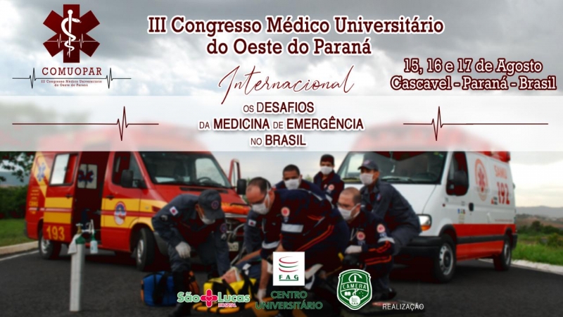 Estão abertas as inscrições para o III COMUOPAR - Congresso Médico Universitário do Oeste do Paraná - Internacional, com o tema: "Os Desafios da Medicina de Emergência no Brasil". O Congresso ocorrerá nos dias 15,16 e 17 de agosto de 2019, no Anfiteatro da Reitoria do Centro Universitário FAG, com uma expectativa de público de 500 participantes. O evento é realizado pelo Centro Acadêmico de Medicina Rui Almeida (CAMERA), com apoio da Coordenação do curso.