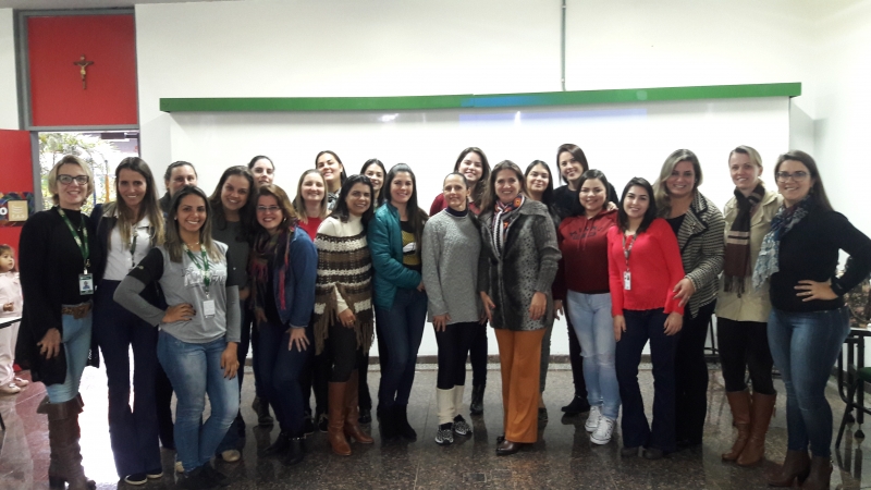 A professora Giovana Romero, do colegiado de Fonoaudiologia do Centro Universitário FAG, ministrou uma palestra sobre voz aos professores de Educação Infantil e Anos Iniciais do Colégio FAG.