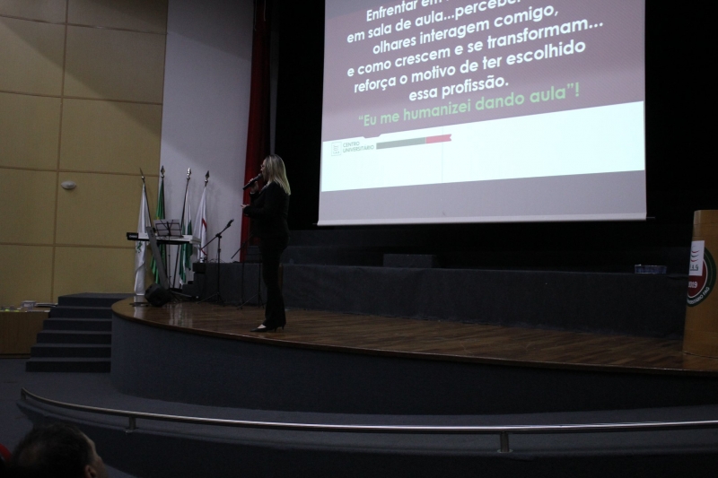 A professora Luana Wulfing, dos cursos de Fisioterapia e Estética e Cosmética, foi a primeira palestrante da noite. O tema proposto por ela foi "Educando para a vida: Uma reflexão sobre a relação Estudante e Professor". "A intenção foi trazer ao corpo docente uma reflexão, um olhar integral sobre os nossos acadêmicos, buscando trazer a essência, aquele primeiro amor que nos fez optar pela carreira de professor", ressaltou a docente.