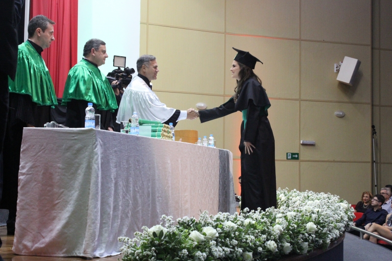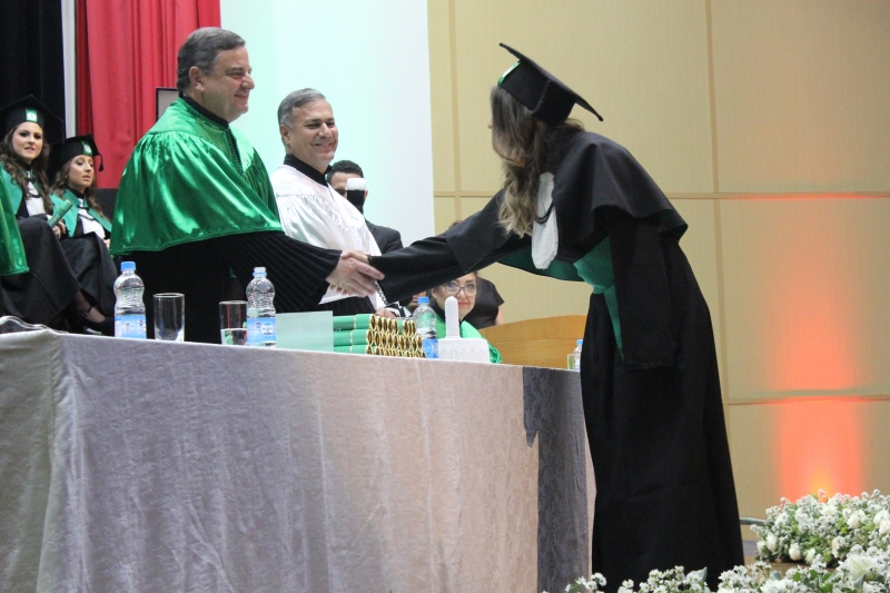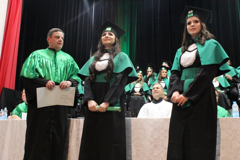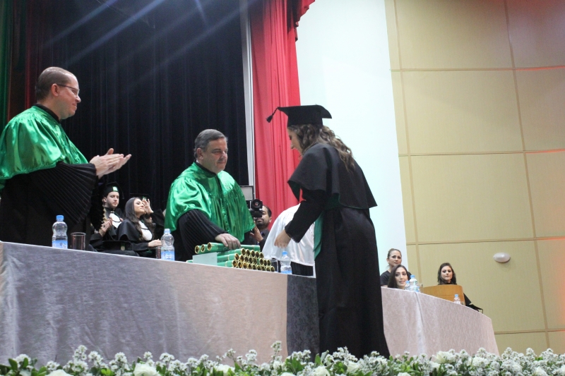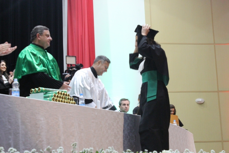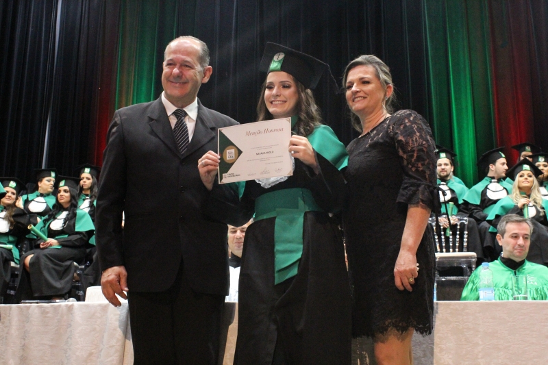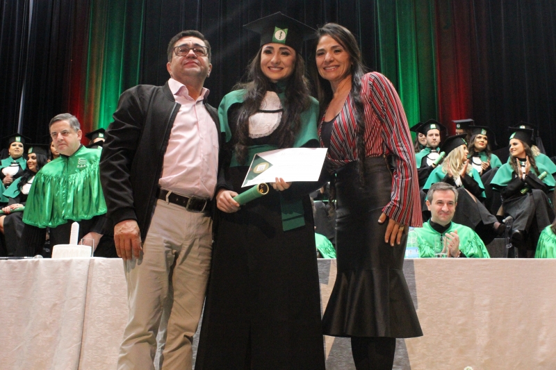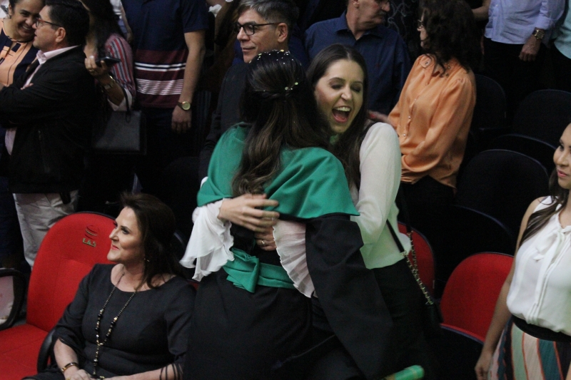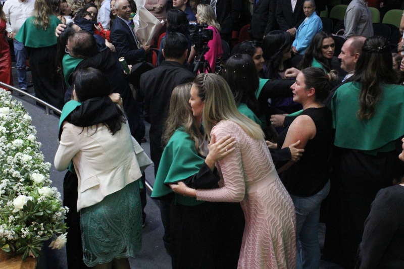 Outro momento de grande emoção para familiares e formandos é a anunciação da láurea acadêmica. Duas formandas empataram nas médias de notas. Karen Mariano de Alencar Pressuto e Natália Miolo receberam o diploma de mérito pelas mãos de seus pais. "Nossa filha é iluminada. Ela mereceu ser laureada, mas nós sabemos que todos os colegas dela lutaram igualmente. Todos estão de parabéns", agradeceram os pais de Karen, Antônio De Alencar e Edneia Mariano de Alencar. A recém-formada está focada em passar nas provas para a residência em Clínica Médica, agora o seu novo desafio. "O Centro FAG foi muito importante até aqui, sou muito grata a todos pela excelente formação que tive. Vou compensar na minha carreira como profissional e ser humano. Sou grata não apenas ao título, mas também aos exemplos que tive, de colegas e de professores".