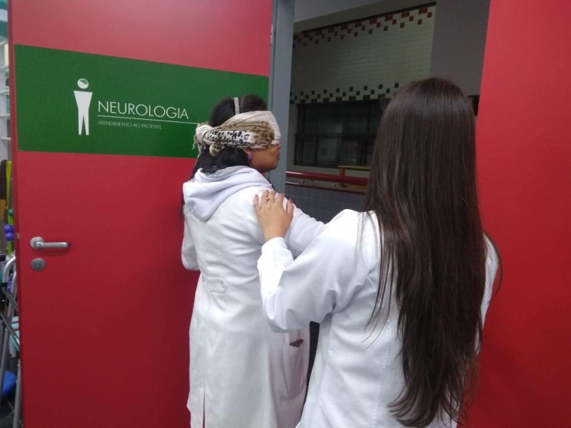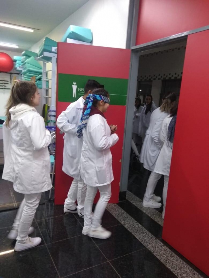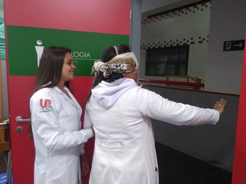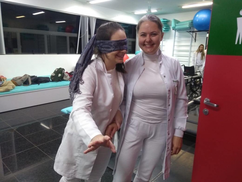 Esse grupo de alunos estão começando os atendimentos às pessoas com diversas deficiências. A intenção da professora foi prepará-los para a compreensão do que os pacientes vivenciam diariamente. Foram quatro tipos de experiências: cadeirante (os alunos fizeram manobras em diferentes ambientes, dando ênfase na resistência, coordenação e autoconfiança); hemiplégico - disfunção total do membro superior (os alunos tiveram que usar o banheiro, assinar seu nome e vestir roupa, dando ênfase na coordenação, planejamento motor e superação); deficiência visual (os alunos andaram em diferentes ambientes, sendo orientados por um terapeuta - colega, com ênfase no esquema corporal, lateralidade, estímulo auditivo, cinestésico e confiança no terapeuta.