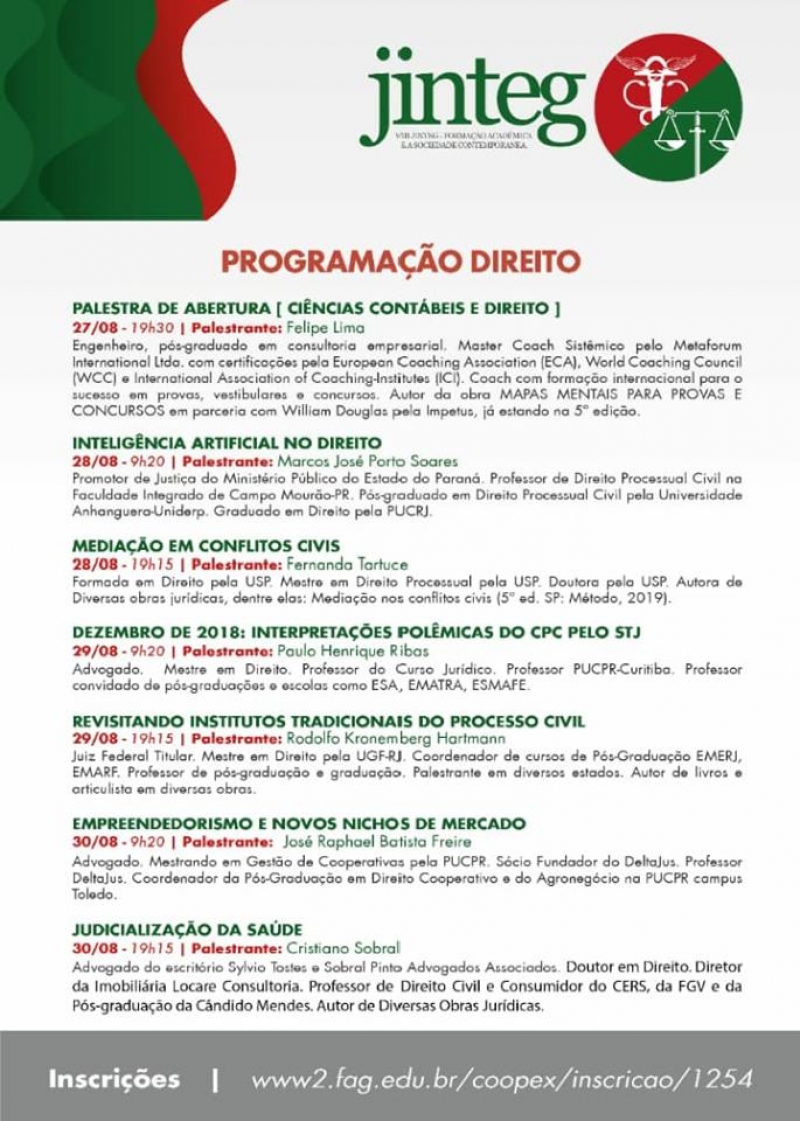 Os cursos de Direito e de Ciências Contábeis do Centro Universitário FAG promovem nesta terça (27) a abertura oficial da VII JINTEG, Jornada Integrada dos cursos de Ciências Contábeis e Direito. O evento acontece entre os dias 27 e 30 de agosto e tem o objetivo de proporcionar aos acadêmicos uma visão contemporânea, a partir do olhar de profissionais das áreas para aprimoramento dos conhecimentos.