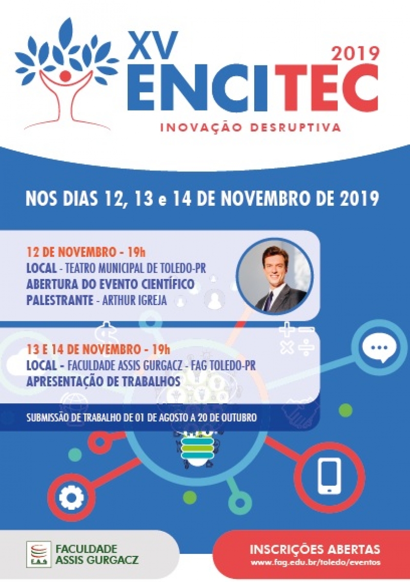 O palestrante Arthur Igreja é o convidado para abrir a 15ª edição do Encontro Científico e Tecnológico (ENCITEC) da FAG Toledo que nesta edição trará o tema "Inovação Disruptiva". O evento com a palestra acontece no dia 12 de novembro no Teatro Municipal a partir das 19h. Arthur é um dos A?s da plataforma AAA junto com Ricardo Amorim do Manhattan Connection e Allan Costa. O convidado realiza uma média de 120 palestras por ano em eventos como Rock in Rio Academy e TEDx no Brasil, EUA, Europa e América do Sul. Igreja também é conselheiro da Fundação Grupo O Boticário.