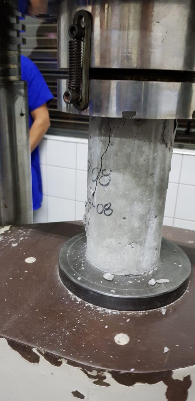 O ensaio de esclerometria é normatizado pela NBR 7584/2012, que esclarece os procedimentos para a realização do procedimento. É necessário calibrar o equipamento, preparar a superfície do concreto, demarcar a área, realizar os golpes com o esclerômetro (esse equipamento funciona com um sistema de mola, então conforme o impacto ele registra um índice esclerométrico), fazer uma análise estatística e utilizar um ábaco para determinar a resistência superficial de compressão do concreto. Além dos corpos de prova utilizados para o ensaio de esclerometria, também foram moldados corpos de prova cilíndricos utilizados para identificação da resistência por meio de um ensaio destrutivo (compressão na prensa).