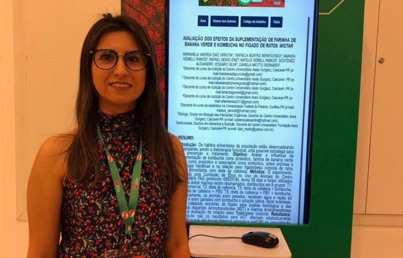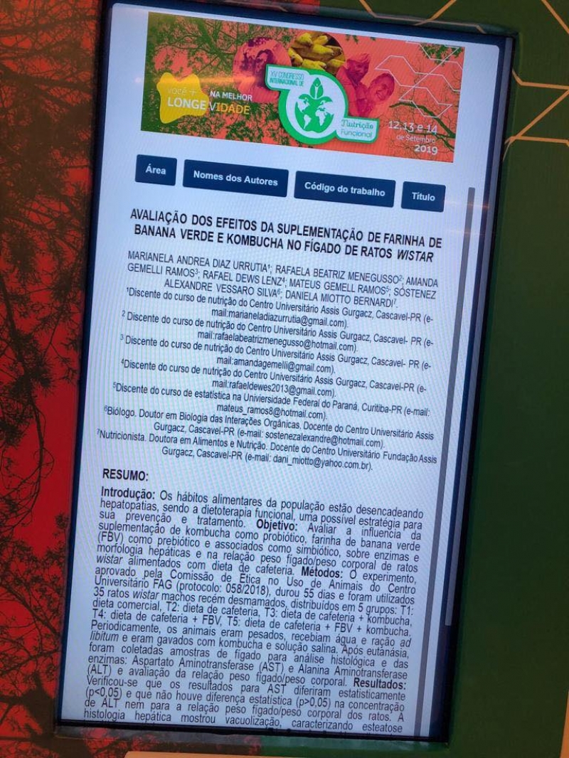 Marianela foi quem fez a apresentação do estudo no evento. Eles fizeram um experimento com ratos, que durou 55 dias. Os animais foram alimentados com ração de cafeteria, suplementação de kombucha e farinha de banana verde. A partir disso, avaliaram os resultados dos efeitos no fígado dos animais. "A ração de cafeteria é feita com ingredientes ricos em gordura saturada, sal e açúcar, sendo uma forma similar à alimentação humana. A dieta desenvolveu esteatose hepática e suplementação isolada e associada de kombucha e farinha de banana verde não preveniu os efeitos deletérios dessa alimentação", explica Marianela.