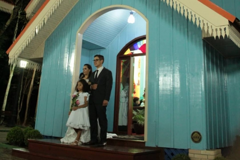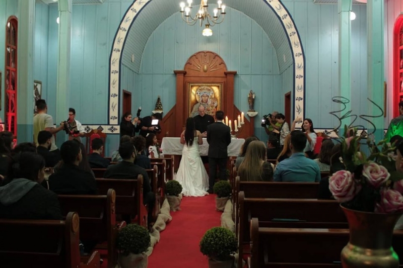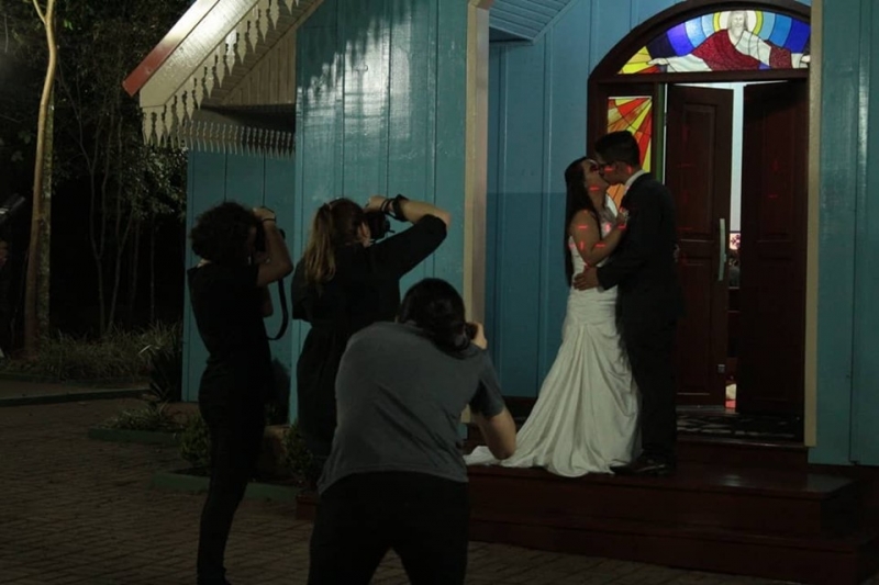 E como a demanda é grande por coberturas em cerimônias, a atividade prática da disciplina de Fotografia Especializada II foi em um casamento simulado na capela Czestochowa, localizada no campus do Centro FAG.