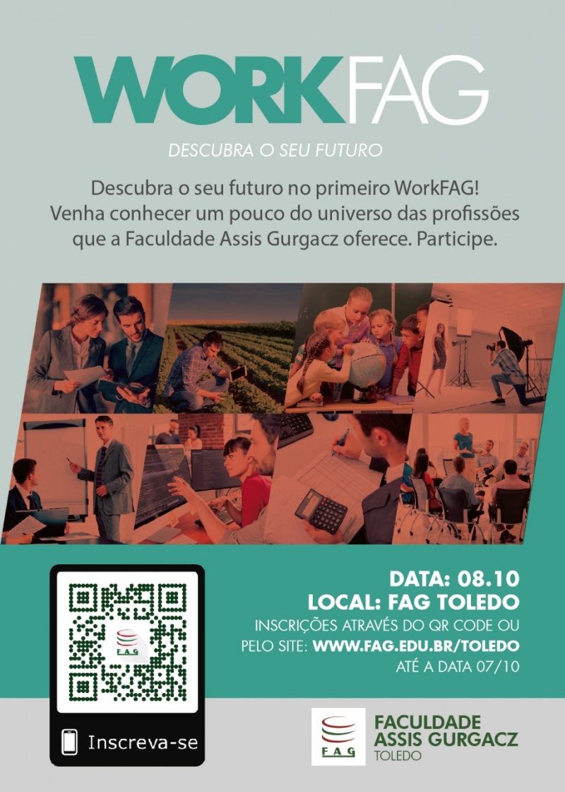 Os estudantes que estão no ensino médio nem sempre tem certeza de qual curso de graduação pretende fazer ou mesmo qual carreira profissional quer seguir. Para contribuir com esta tomada de decisão, a FAG Toledo realiza nesta terça-feira (8) a 1ª edição do WorkFAG, uma mostra de profissões onde todos os cursos de graduação estarão expondo seus projetos, professores, atividades realizadas, objetivos e possibilidades de atuação profissional. Além da equipe de professores e técnicos da FAG Toledo os estudantes também serão recepcionados por acadêmicos dos cursos que vão falar um pouco das próprias experiências durante o processo de formação. "Queremos apresentar para estes jovens as diversas possibilidades que temos para formação profissional. Cursos de Licenciatura, Bacharelado e Tecnologia em diferentes áreas, com notas e classificações excelentes pelo MEC e que promovem uma inserção muito significativa no mercado de trabalho", alerta o diretor da FAG Toledo, Ildo Bombardelli.