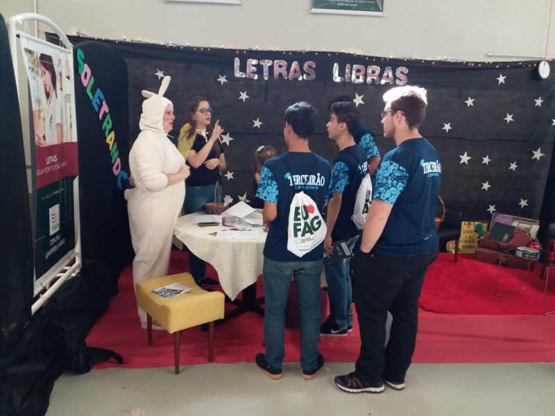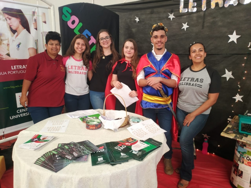O curso de Letras Língua Portuguesa e Libras da FAG Toledo participou do evento Work FAG com um estande especial para receber os estudantes de ensino médio que visitaram a instituição nesta terça-feira (8). Na entrada do Ginásio de Esportes foi montada a estrutura do curso. Os acadêmicos receberam os estudantes em uma estrutura que remeto ao mundo das letras. Alguns alunos do curso se fantasiaram como personagens de contos de fadas para homenagear histórias que sempre mexeram com o lúdico das crianças e auxiliar no desenvolvimento do hábito da leitura. "Ficou muito legal o espaço, com esta máquina de escrever que remete aos escritores de antigamente. Um clima muito bacana e tem tudo a ver com o universo da escrita e da leitura", comenta a estudante Ana Luiza Matos que está no ensino médio e pretende estudar Letras em 2020. O evento Work FAG é uma mostra de profissões realizada para apresentar os cursos da FAG Toledo aos futuros acadêmicos e auxiliar na descoberta das profissões e na escolha da graduação que pretende cursar.
