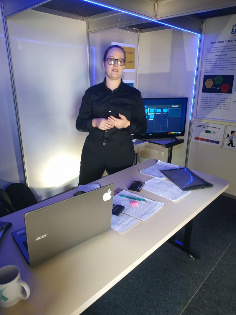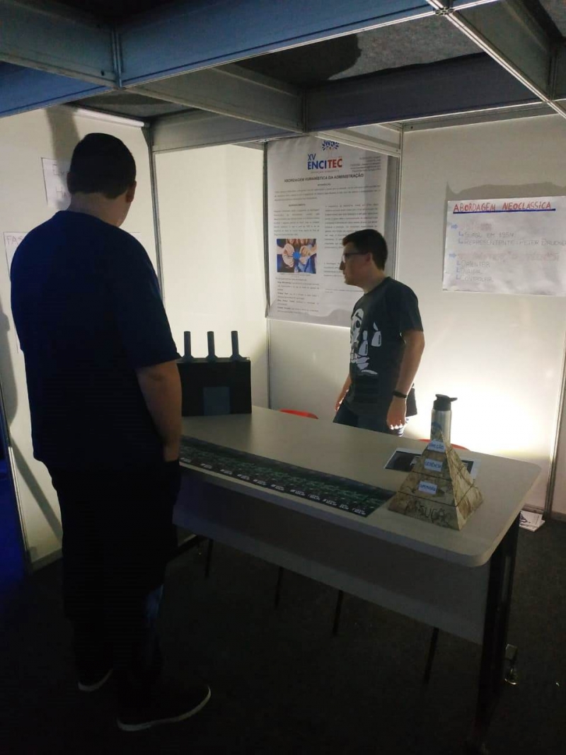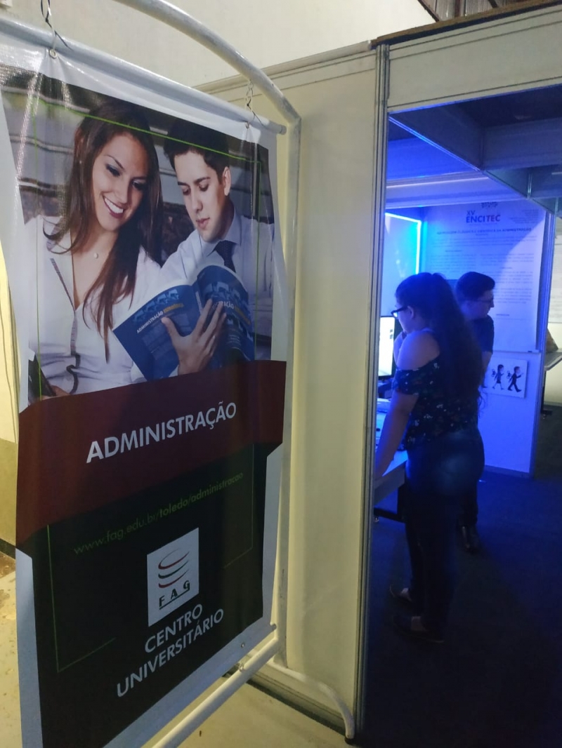 Os estudantes do ensino médio que participaram do Work FAG da FAG Toledo nesta terça-feira (8) foram recebidos no ginásio de esportes, do lado esquerdo, por acadêmicos do curso de Administração. O colegiado instalou um túnel do tempo no local, com vários estantes mostrando as mais importantes teorias da área e a evolução destes processos. "Tivemos a feliz ideia de colocar nossos acadêmicos participando ativamente no desenvolvimento desta atividade. Eles foram atrás, pesquisaram a melhor maneira de instalar o estande, de mostrar o que o curso e a área têm a oferecer e isto foi muito enriquecedor para eles", relata o coordenador Luis Carlos Fabris. O primeiro estande trata dos antecedentes históricos da Administração e conforme o visitante avança, vai conhecendo as novas teorias e sistemáticas de atuação na área. "Este trabalho também é fruto da pesquisa que eles realizaram ao longo do ano para o nosso encontro científico que acontece no mês que vem. É uma prévia do que vão apresentar para o público em geral durante o Encitec", explica Fabris.