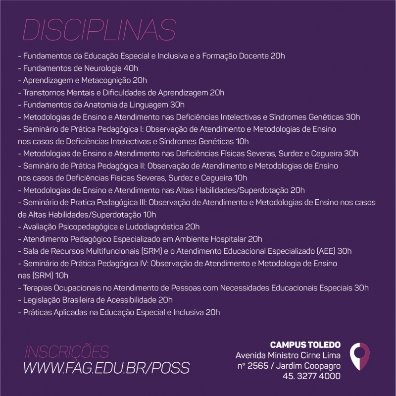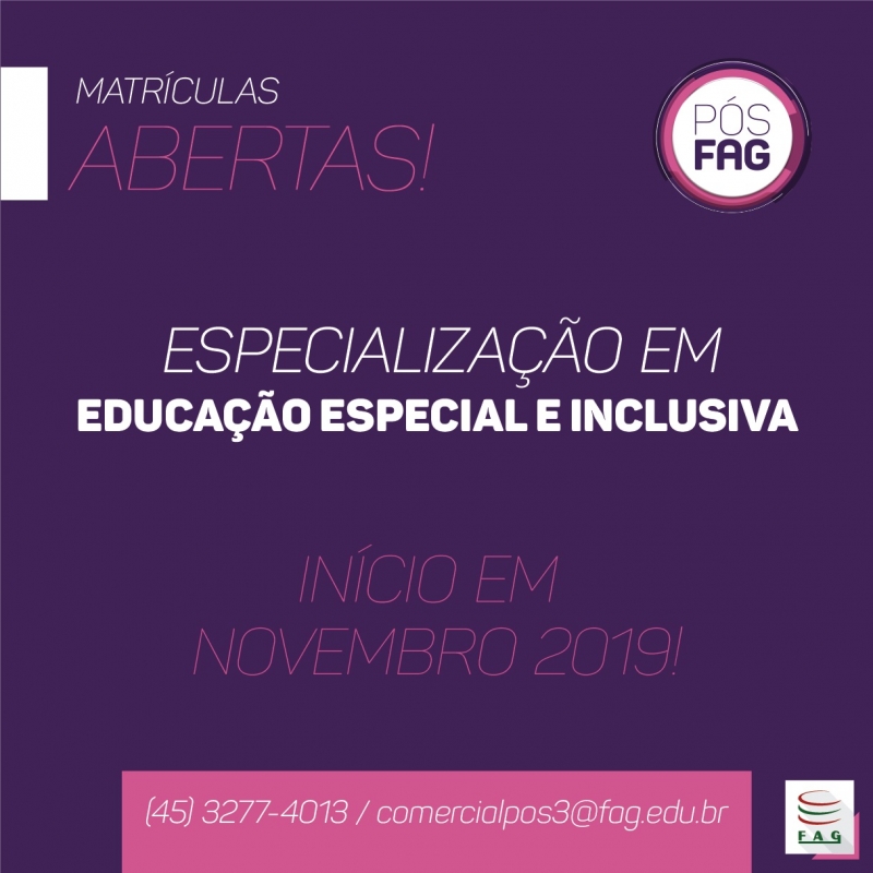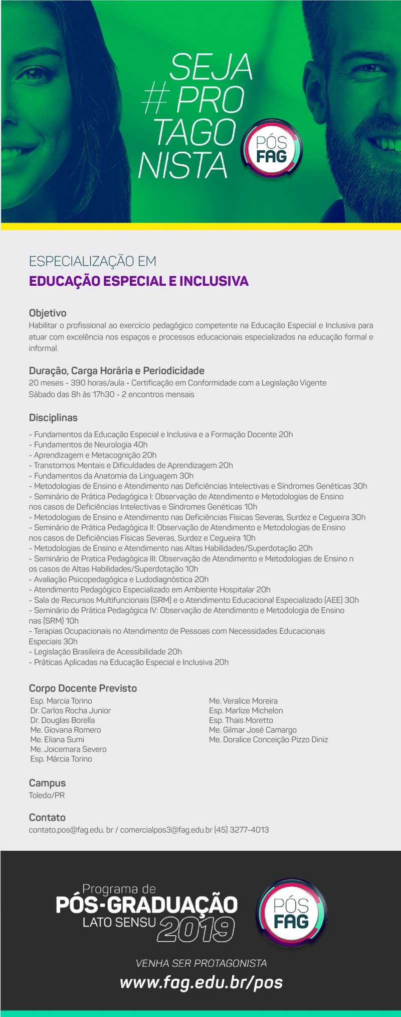 A FAG Toledo acaba de abrir as inscrições para o mais novo curso de pós-graduação da instituição. Trata-se da Especialização em Educação Especial e Inclusiva.
