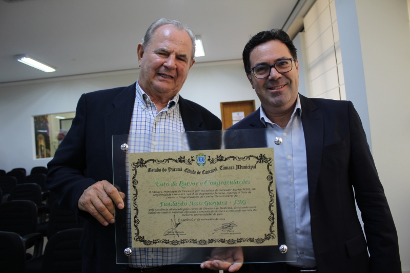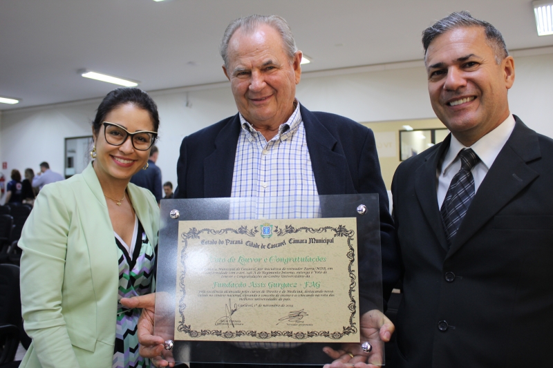 O Centro Universitário FAG recebeu hoje (01) Voto de Louvor e Congratulações da Câmara de Vereadores de Cascavel. A honraria foi proposta pelo vereador Roberto Parra (MDB) por conta das conquistas dos cursos de Medicina e Direito da Instituição. Participaram da cerimônia realizada na Casa de Leis o Reitor, Assis Gurgacz, a Pró-reitora Administrativa, Jaqueline Gurgacz Ferreira, o Vice-reitor, Sérgio De Angelis, o Coordenador de Medicina, Rui Almeida, e Coordenadora de Direito, Viviana Bianconi.