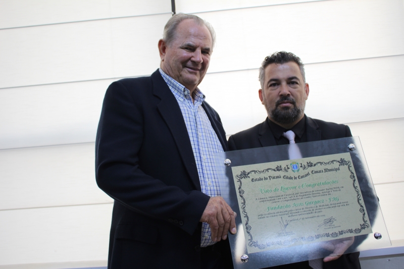 Representando a mantenedora da Instituição, o Vice-reitor, Sérgio De Angelis, usou a tribuna para agradecer a honraria e também contar um pouco da história do Centro FAG, que completou 20 anos em 2019. "A realização do sonho da família Gurgacz com a implantação da FAG também significa a realização de sonhos para milhares de pessoas que passaram pela Instituição. E esse sonho não para aqui, ainda temos muito a realizar, esperem que muitas novidades virão. O reconhecimento público demonstra que, de fato, a Instituição alcançou o patamar de relevância social tão almejado".