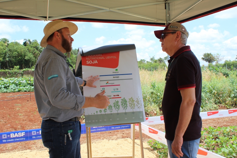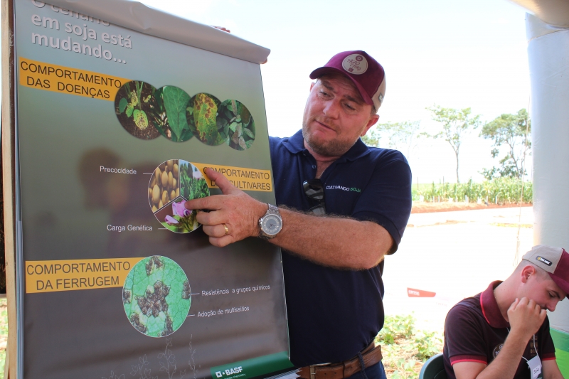 A BASF, em seu estande, expôs o "Manejo de Doenças na Cultura da Soja". "Trouxemos o nosso portfólio, com os principais produtos nesse manejo, focando na primeira, segunda e terceira aplicações e nos intervalos de aplicações com as opções Orquestra, Ativum, Versaties e Spot SC", conta o engenheiro agrônomo, Everton.